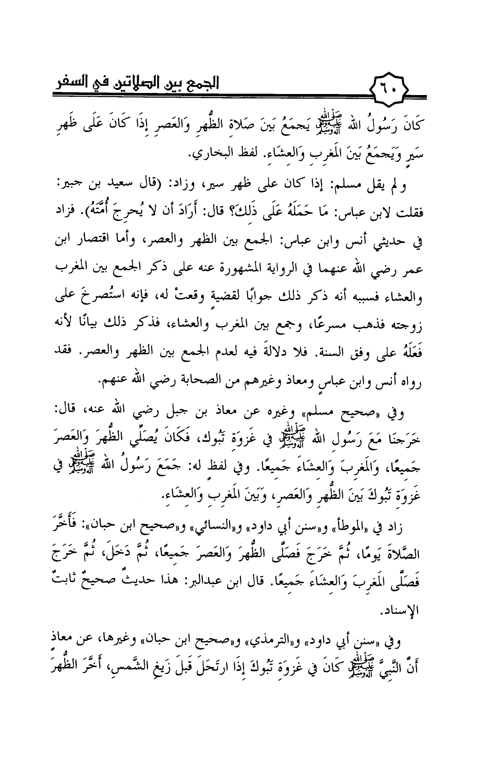 ولم يقل مسلم: إذا كان على ظهر سير، وزاد: (قال سعيد بن جبير: فقلت لابن عباس: ما حمله على ذلك؟ قال: أراد أن لا يحرج أمّته). فزاد في حديثي أنس وابن عباس: الجمع بين الظهر والعصر، وأما اقتصار ابن عمر رضي الله عنهما في الرواية المشهورة عنه على ذكر الجمع بين المغرب والعشاء فسببه أنه ذكر ذلك جوابًا لقضية وقعتْ له، فإنه استصرخ على زوجته فذهب مسرعًا، وجمع بين المغرب والعشاء، فذكر ذلك بيانًا لأنه فعله على وفق السنة. فلا دلالة فيه لعدم الجمع بين الظهر والعصر. فقد رواه أنس وابن عباس ومعاذ وغيرهم من الصحابة رضي الله عنهم.