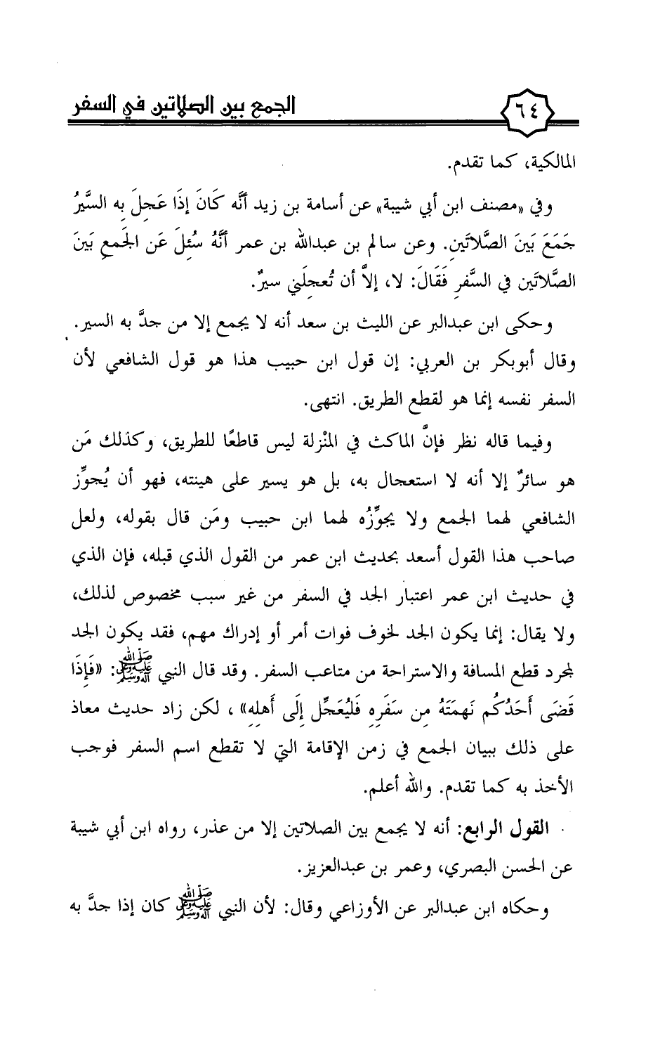 وفي "مصنف ابن أبي شيبة" عن أسامة بن زيد أنّه كان إذا عجل به السّير جمع بين الصّلاتين. وعن سالم بن عبد الله بن عمر أنّه سئل عن الجمع بين الصّلاتين في السّفر فقال: لا، إلاّ أن تعجلني سير.
