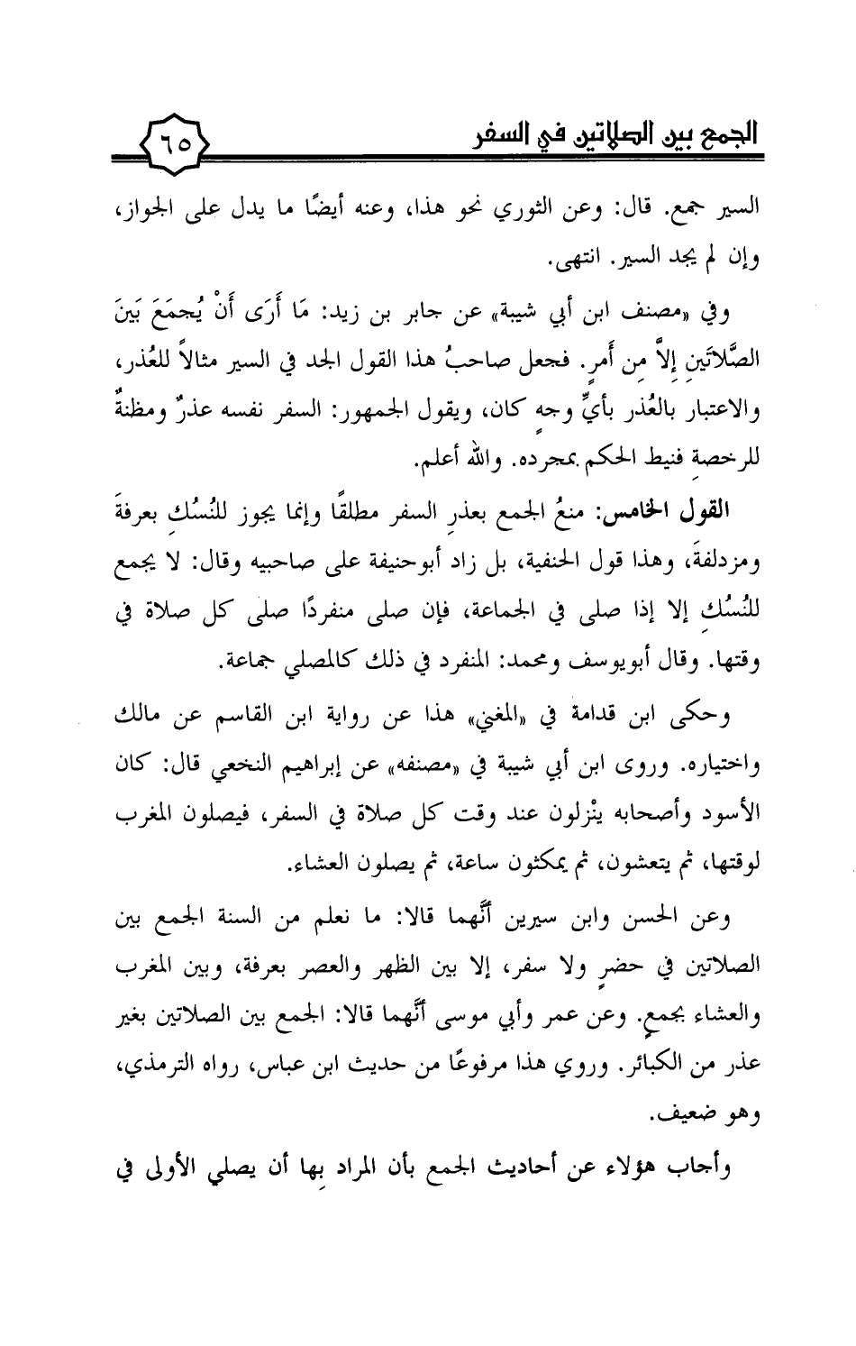 القول الخامس: منع الجمع بعذر السفر مطلقًا وإنما يجوز للنسك بعرفة ومزدلفة، وهذا قول الحنفية، بل زاد أبوحنيفة على صاحبيه وقال: لا يجمع للنسك إلا إذا صلى في الجماعة، فإن صلى منفردًا صلى كل صلاة في وقتها. وقال أبويوسف ومحمد: المنفرد في ذلك كالمصلي جماعة.