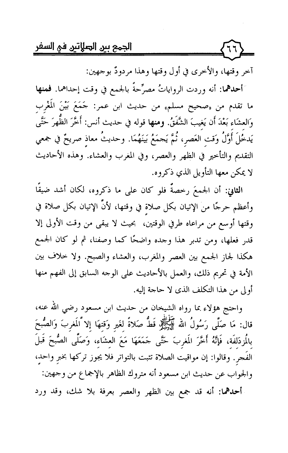 الثاني: أن الجمع رخصة فلو كان على ما ذكروه، لكان أشد ضيقًا وأعظم حرجًا من الإتيان بكل صلاة في وقتها، لأنّ الإتيان بكل صلاة في وقتها أوسع من مراعاه طرفي الوقتين، بحيث لا يبقى من وقت الأولى إلا قدر فعلها، ومن تدبر هذا وجده واضحًا كما وصفنا، ثم لو كان الجمع هكذا لجاز الجمع بين العصر والمغرب، والعشاء والصبح. ولا خلاف بين الأمة في تحريم ذلك، والعمل بالأحاديث على الوجه السابق إلى الفهم منها أولى من هذا التكلف الذى لا حاجة إليه.