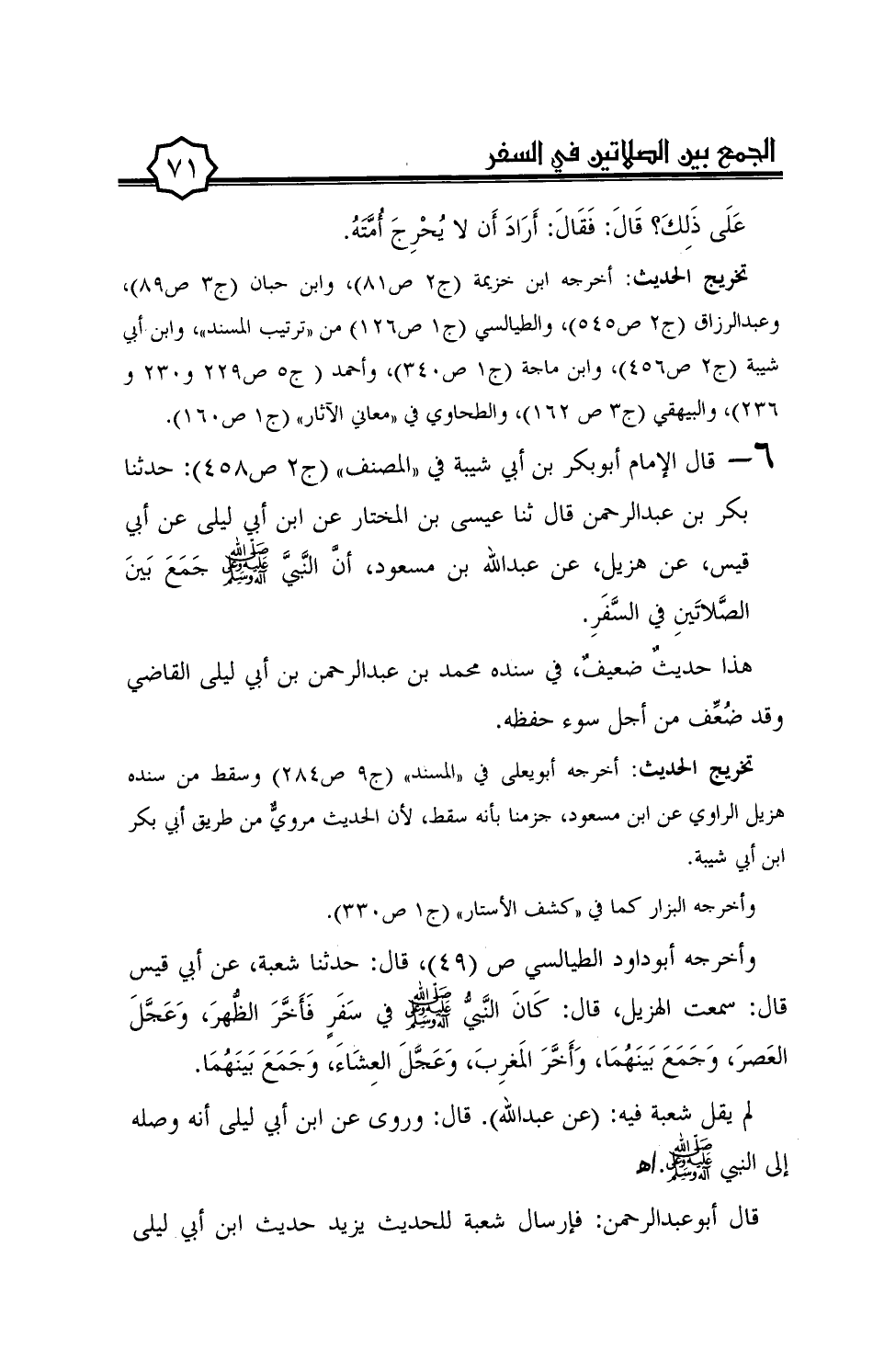 6 - قال الإمام أبوبكر بن أبي شيبة في "المصنف" (ج2 ص458): حدثنا بكر بن عبد الرحمن قال ثنا عيسى بن المختار عن ابن أبي ليلى عن أبي قيس، عن هزيل، عن عبد الله بن مسعود، أنّ النّبيّ صلى الله عليه وعلى آله وسلم جمع بين الصّلاتين في السّفر.