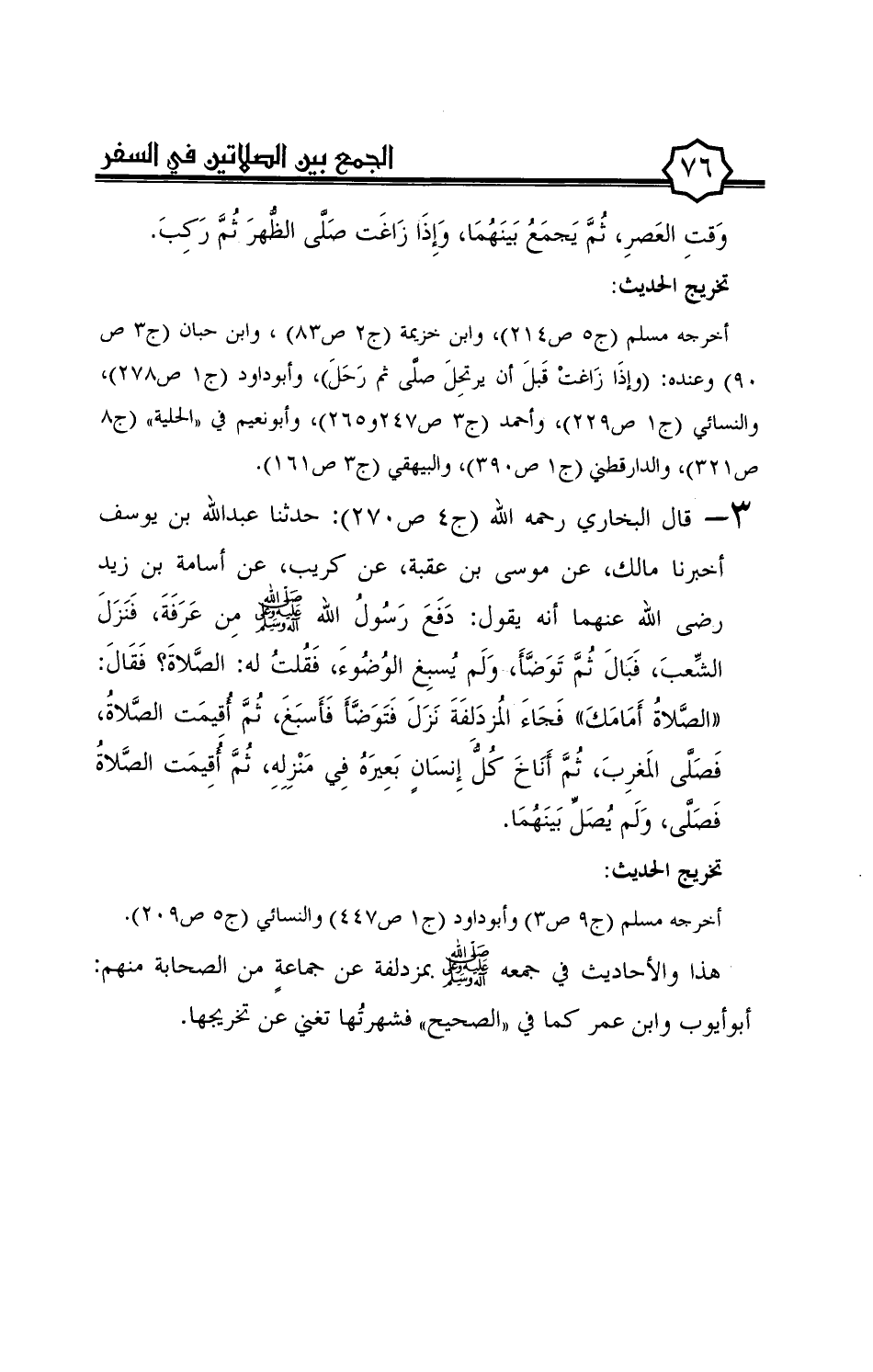 3 - قال البخاري رحمه الله (ج4 ص270): حدثنا عبد الله بن يوسف أخبرنا مالك، عن موسى بن عقبة، عن كريب، عن أسامة بن زيد رضى الله عنهما أنه يقول: دفع رسول الله صلى الله عليه وعلى آله وسلم من عرفة، فنزل الشّعب، فبال ثمّ توضّأ، ولم يسبغ الوضوء، فقلت له: الصّلاة؟ فقال: