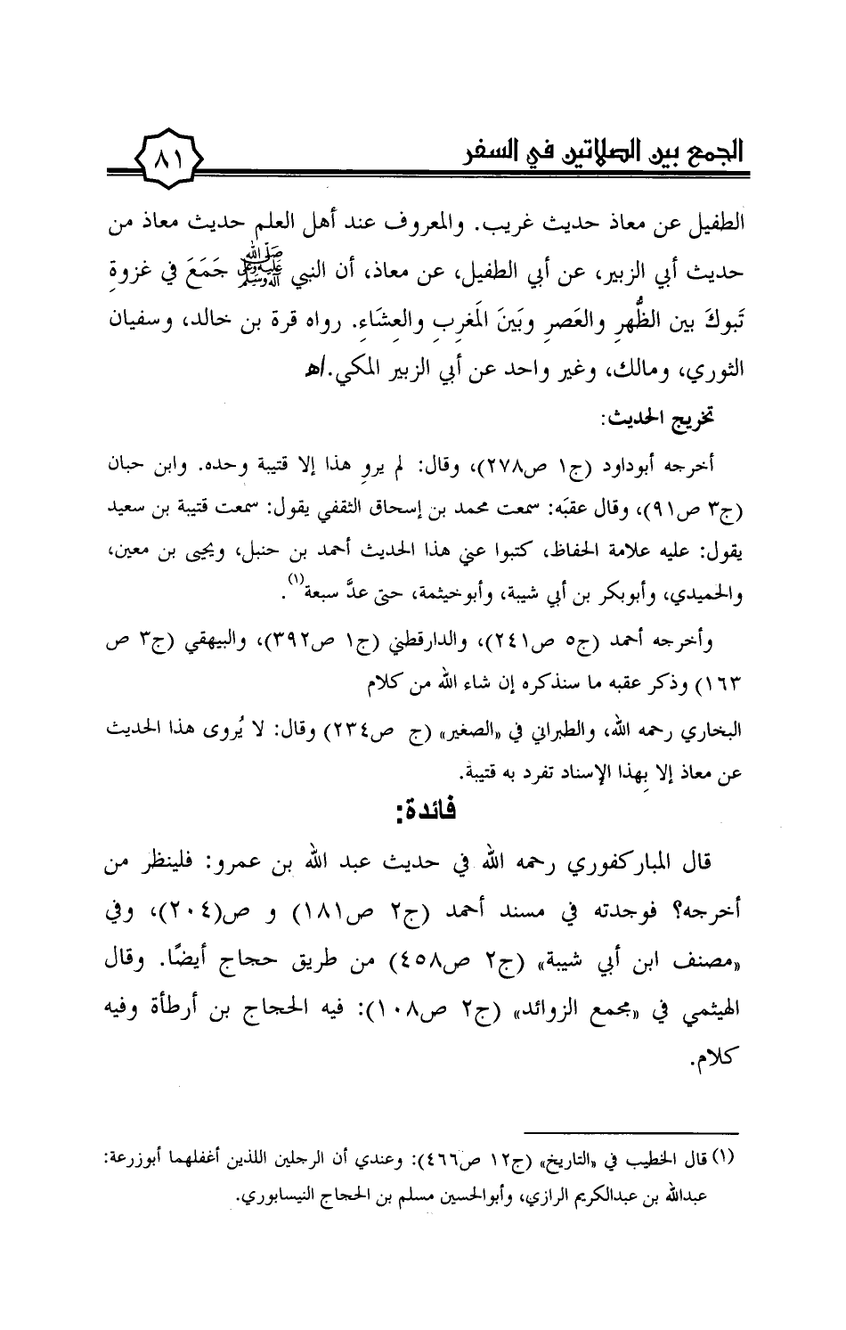الطفيل عن معاذ حديث غريب. والمعروف عند أهل العلم حديث معاذ من حديث أبي الزبير، عن أبي الطفيل، عن معاذ، أن النبي صلى الله عليه وعلى آله وسلم جمع في غزوة تبوك بين الظّهر والعصر وبين المغرب والعشاء. رواه قرة بن خالد، وسفيان الثوري، ومالك، وغير واحد عن أبي الزبير المكي.