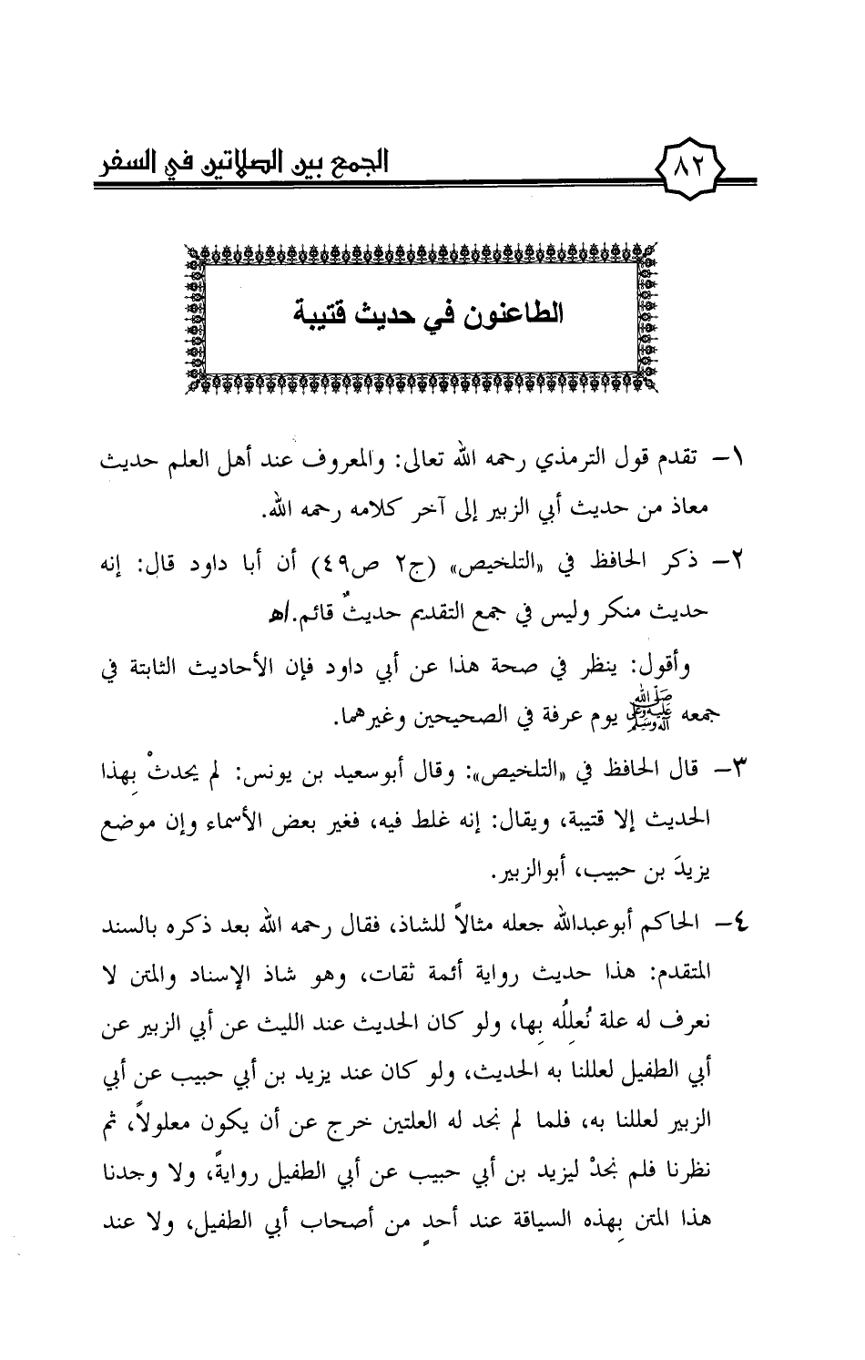 2 - ذكر الحافظ في "التلخيص" (ج2 ص49) أن أبا داود قال: إنه حديث منكر وليس في جمع التقديم حديث قائم.