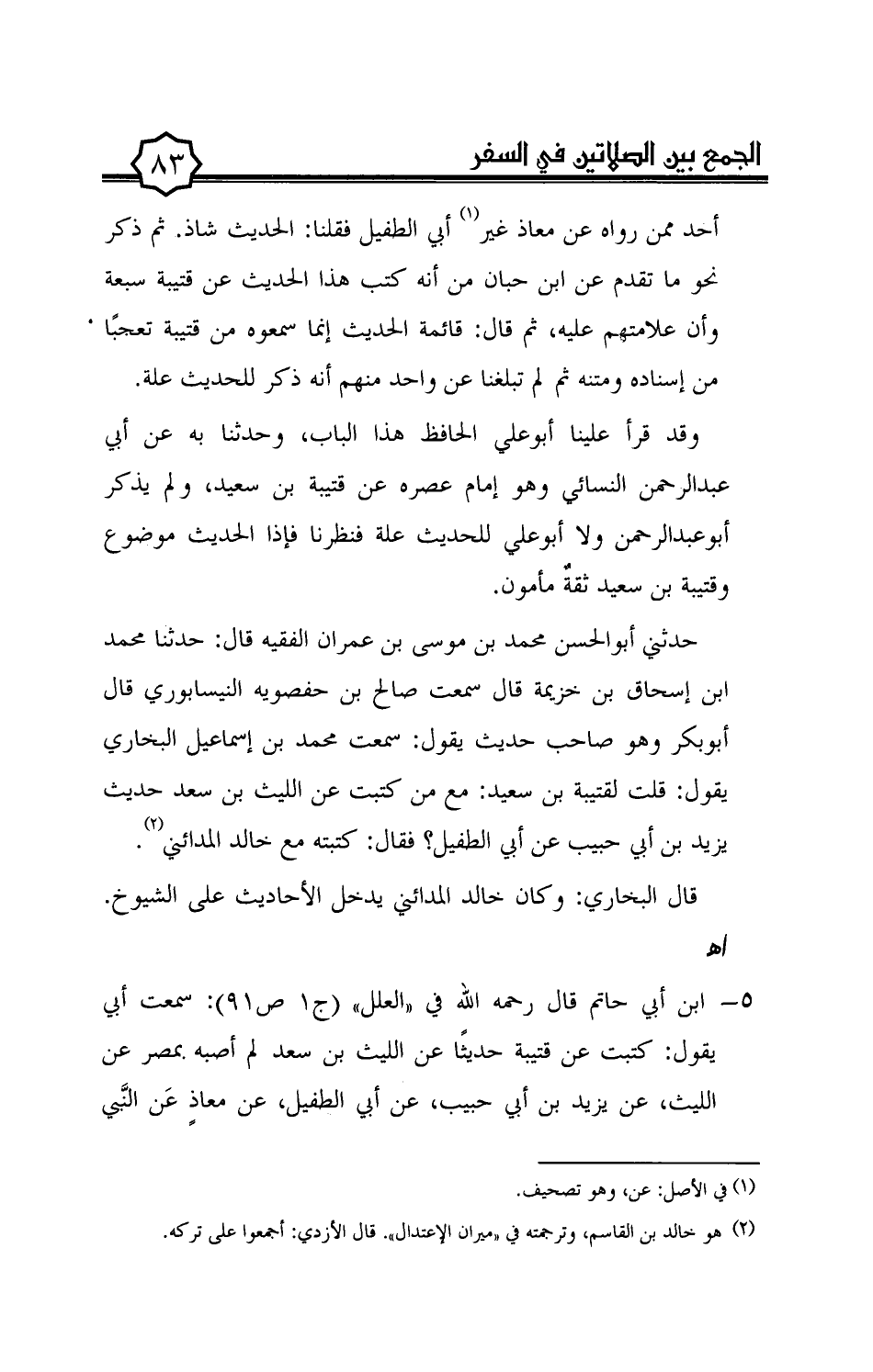حدثني أبوالحسن محمد بن موسى بن عمران الفقيه قال: حدثنا محمد ابن إسحاق بن خزيمة قال سمعت صالح بن حفصويه النيسابوري قال أبوبكر وهو صاحب حديث يقول: سمعت محمد بن إسماعيل البخاري يقول: قلت لقتيبة بن سعيد: مع من كتبت عن الليث بن سعد حديث يزيد بن أبي حبيب عن أبي الطفيل؟ فقال: كتبته مع خالد المدائني (¬2).
