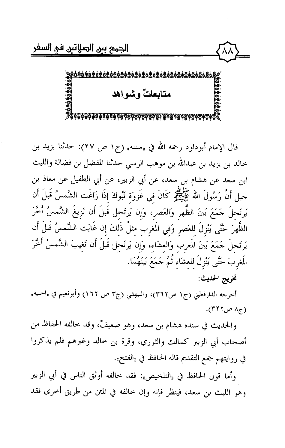قال الإمام أبوداود رحمه الله في "سننه" (ج1 ص 27): حدثنا يزيد بن خالد بن يزيد بن عبد الله بن موهب الرملي حدثنا المفضل بن فضالة والليث ابن سعد عن هشام بن سعد، عن أبي الزبير، عن أبي الطفيل عن معاذ بن جبل أنّ رسول الله صلى الله عليه وعلى آله وسلم كان في غزوة تبوك إذا زاغت الشّمس قبل أن يرتحل جمع بين الظّهر والعصر، وإن يرتحل قبل أن تزيغ الشّمس أخّر الظّهر حتّى ينْزل للعصر وفي المغرب مثل ذلك إن غابت الشّمس قبل أن يرتحل جمع بين المغرب والعشاء، وإن يرتحل قبل أن تغيب الشّمس أخّر المغرب حتّى ينْزل للعشاء ثمّ جمع بينهما.