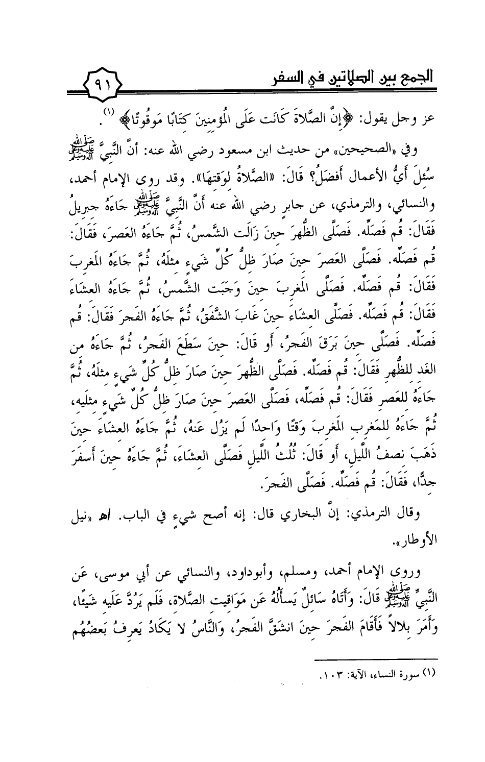 وفي "الصحيحين" من حديث ابن مسعود رضي الله عنه: أنّ النّبيّ صلى الله عليه وعلى آله وسلم سئل أيّ الأعمال أفضل؟ قال: ((الصّلاة لوقتها)). وقد روى الإمام أحمد، والنسائي، والترمذي، عن جابر رضي الله عنه أنّ النّبيّ صلى الله عليه وعلى آله وسلم جاءه جبريل فقال: قم فصلّه. فصلّى الظّهر حين زالت الشّمس، ثمّ جاءه العصر، فقال: قم فصلّه. فصلّى العصر حين صار ظلّ كلّ شيء مثله، ثمّ جاءه المغرب فقال: قم فصلّه. فصلّى المغرب حين وجبت الشّمس، ثمّ جاءه العشاء فقال: قم فصلّه. فصلّى العشاء حين غاب الشّفق، ثمّ جاءه الفجر فقال: قم فصلّه. فصلّى حين برق الفجر، أو قال: حين سطع الفجر، ثمّ جاءه من الغد للظّهر فقال: قم فصلّه. فصلّى الظّهر حين صار ظلّ كلّ شيء مثله، ثمّ جاءه للعصر فقال: قم فصلّه، فصلّى العصر حين صار ظلّ كلّ شيء مثليه، ثمّ جاءه للمغرب المغرب وقتًا واحدًا لم يزل عنه، ثمّ جاءه العشاء حين ذهب نصف اللّيل، أو قال: ثلث اللّيل فصلّى العشاء، ثمّ جاءه حين أسفر جدًّا، فقال: قم فصلّه. فصلّى الفجر.