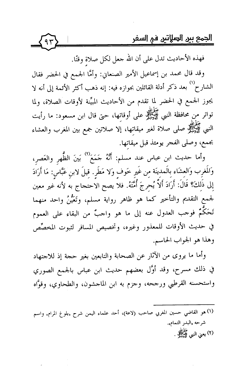 وقد قال محمد بن إسماعيل الأمير الصنعاني: وأمّا الجمع في الحضر فقال الشارح (¬1) بعد ذكر أدلة القائلين بجوازه فيه: إنه ذهب أكثر الأئمة إلى أنه لا يجوز الجمع في الحضر لما تقدم من الأحاديث المبيّنة لأوقات الصلاة، ولما تواتر من محافظة النبي صلى الله عليه وعلى آله وسلم على أوقاتها، حتى قال ابن مسعود: ما رأيت النبي صلى الله عليه وعلى آله وسلم صلى صلاة لغير ميقاتها، إلا صلاتين جمع بين المغرب والعشاء بجمع، وصلى الفجر يومئذ قبل ميقاتها.