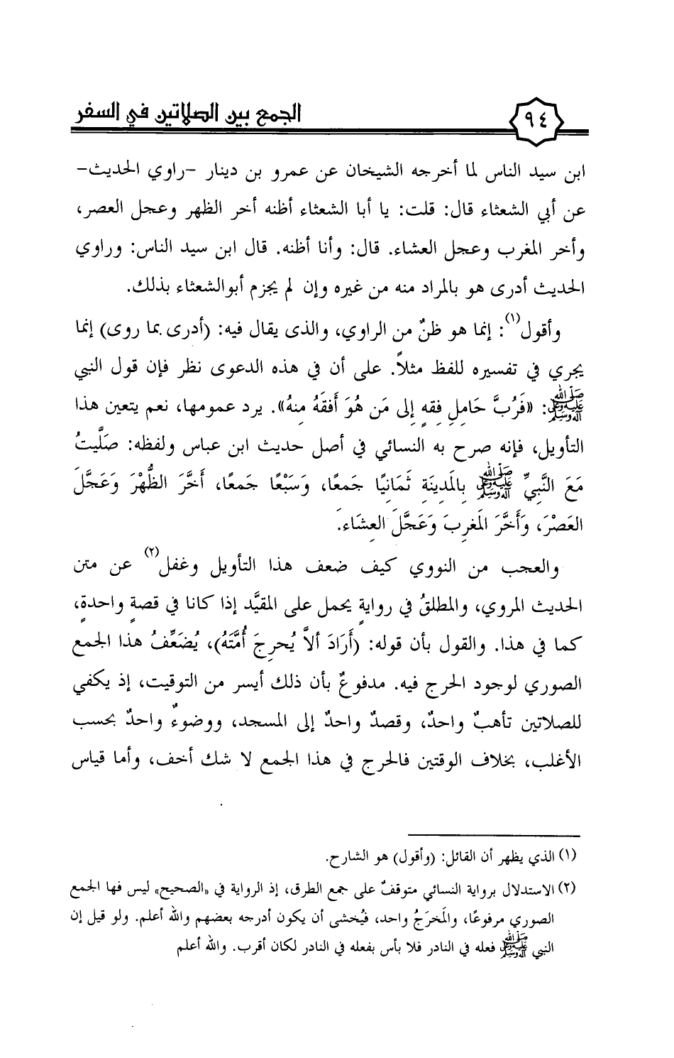 وأقول (¬1): إنما هو ظن من الراوي، والذى يقال فيه: (أدرى بما روى) إنما يجري في تفسيره للفظ مثلاً. على أن في هذه الدعوى نظر فإن قول النبي صلى الله عليه وعلى آله وسلم: ((فربّ حامل فقه إلى من هو أفقه منه)). يرد عمومها، نعم يتعين هذا التأويل، فإنه صرح به النسائي في أصل حديث ابن عباس ولفظه: صلّيت مع النّبيّ صلى الله عليه وعلى آله وسلم بالمدينة ثمانيًا جمعًا، وسبْعًا جمعًا، أخّر الظّهْر وعجّل العصْر، وأخّر المغرب وعجّل العشاء.