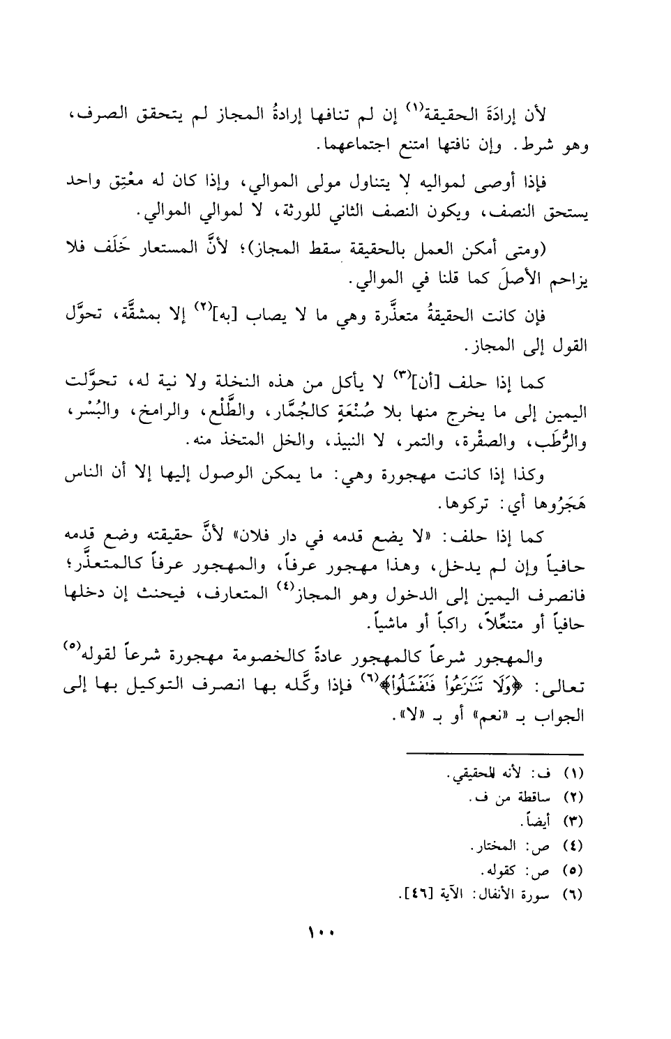 فإن كانت الحقيقة متعذرة - وهي ما لا يصاب به إلا بمشقة - تحول القول إلى المجاز، كما إذا حلف لا يأكل من هذه النخلة ولا نية له، تحولت اليمين إلى ما يخرج منها بلا صنعة كالجمار والطلع والرامخ والبسر والرطب وصفره والتمر والنبيذ والخل المتخذ منه.