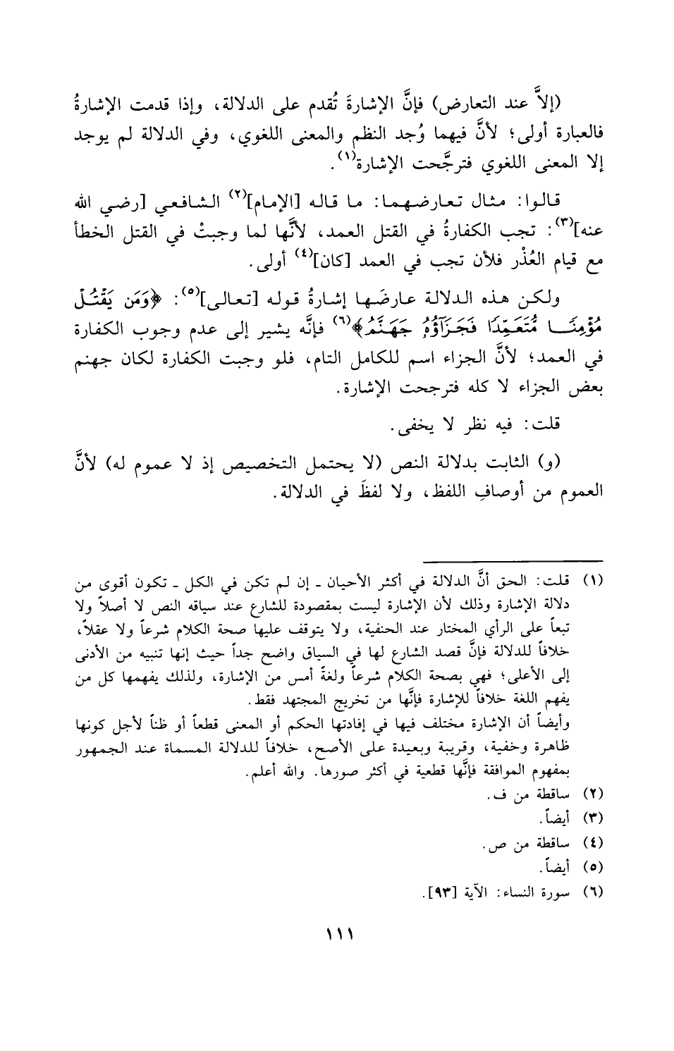 قالوا: مثال تعارضهما ما قاله الإمام الشافعي [رضي الله عنه]: تجب الكفارة في القتل العمد؛ لأنها لَمَّا وجبت في القتل الخطأ مع قيام العذر فلأن تجب في العمد أولى، ولكن هذه الدلالة عارضها إشارة قوله [تعالى]: {وَمَنْ يَقْتُلْ مُؤْمِناً مُتَعَمِّداً فَجَزَاؤُهُ جَهَنَّمُ}، فإنه يشير إلى عدم وجوب الكفارة في العمد؛ لأن الجزاء اسم للكامل التام، فلو وجبت الكفارة لكان جهنم بعض الجزاء لا كله، فرجحت الإشارة.