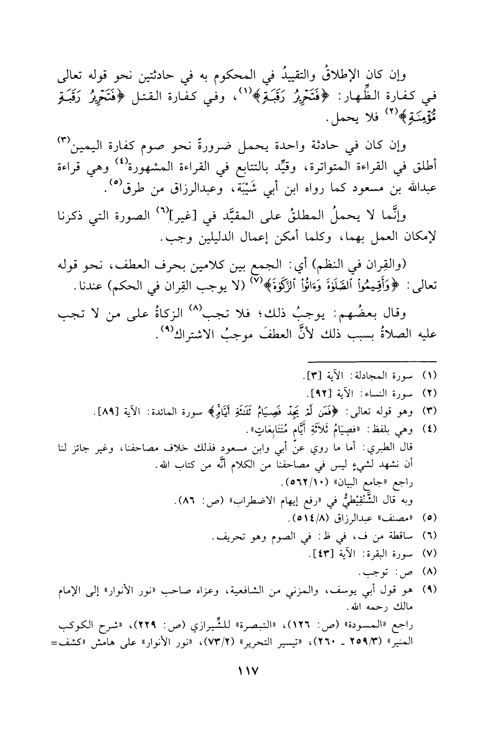 (والقِران في النظم): أي الجمع بين كلامين بحرف العطف، نحو قوله تعالى: {وَأَقِيمُوا الصَّلاةَ وَآتُوا الزَّكَاةَ} (لا يوجب القِران في الحكم) عندنا.