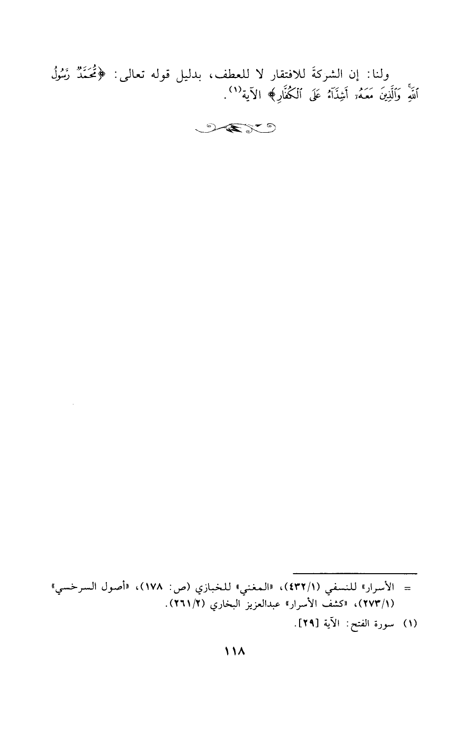 ولنا: إن الشركة للافتقار لا للعطف بدليل قوله تعالى: {مُحَمَّدٌ رَسُولُ اللَّهِ وَالَّذِين مَعَهُ أَشِدَّاءُ عَلَى الْكُفَّارِ} الآية.