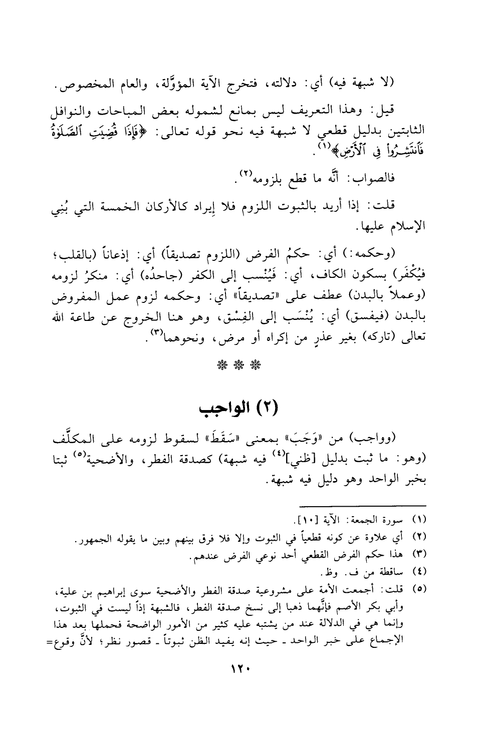 قيل: هذا التعريف ليس بمانع لشموله بعض المباحات والنوافل الثابتين بدليل قطعي لا شبهة فيه، نحو قوله تعالى: {فَإِذَا قُضِيَتِ الصَّلاةُ فَانْتَشِرُوا فِي الْأَرْضِ}، فالصواب: أنه ما قطع بلزومه.