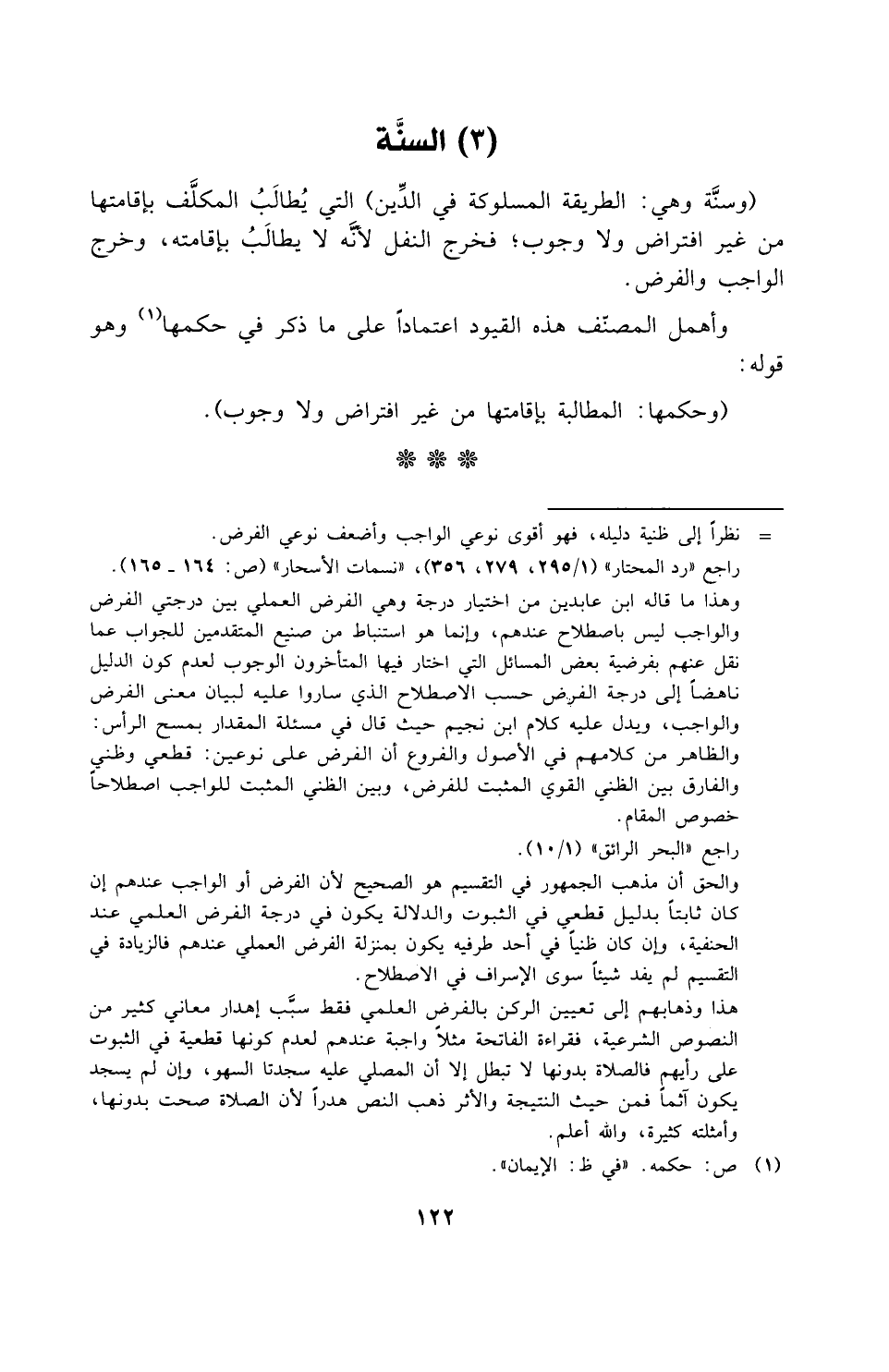 (وسنة: وهي الطريقة المسلوكة في الدين) التي يطالب المكلف بإقامتها من غير افتراض ولا وجوب، فخرج النفل؛ لأنه لا يطالب بإقامته، وخرج الواجب والفرض.