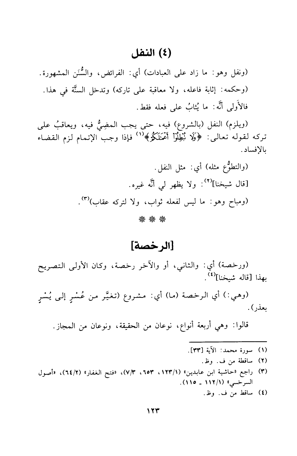 (ويلزم) النفل (بالشروع) فيه حتى يجب المضي فيه، ويعاقب على تركه لقوله تعالى: {وَلا تُبْطِلُوا أَعْمَالَكُمْ}، فإذا وجب الإتمام لزم القضاء بالإفساد (والتطوع مثله): أي مثل النفل.