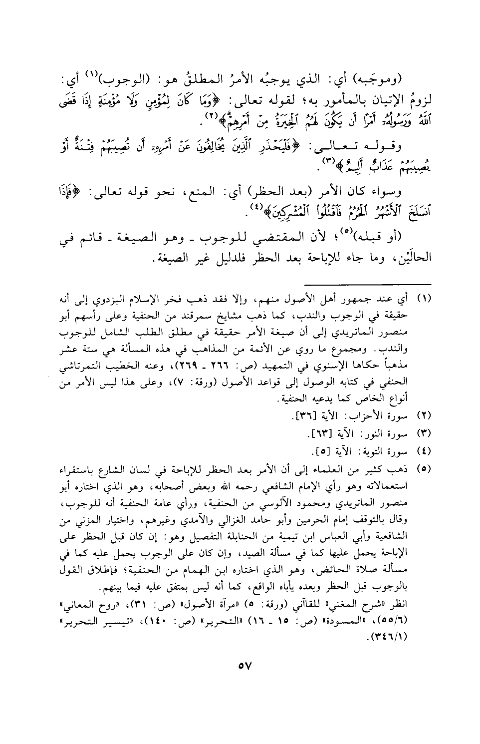 (وموجبه): أي الذي يوجبه الأمر المطلق هو (الوجوب) أي لزوم الإتيان بالمأمور به؛ لقوله تعالى: {وَمَا كَانَ لِمُؤْمِنٍ وَلا مُؤْمِنَةٍ إِذَا قَضَى اللَّهُ وَرَسُولُهُ أَمْراً أَنْ يَكُونَ لَهُمُ الْخِيَرَةُ مِنْ أَمْرِهِمْ}، وقوله تعالى: {فَلْيَحْذَرِ الَّذِينَ يُخَالِفُونَ عَنْ أَمْرِهِ أَنْ تُصِيبَهُمْ فِتْنَةٌ أَوْ يُصِيبَهُمْ عَذَابٌ أَلِيمٌ}.
