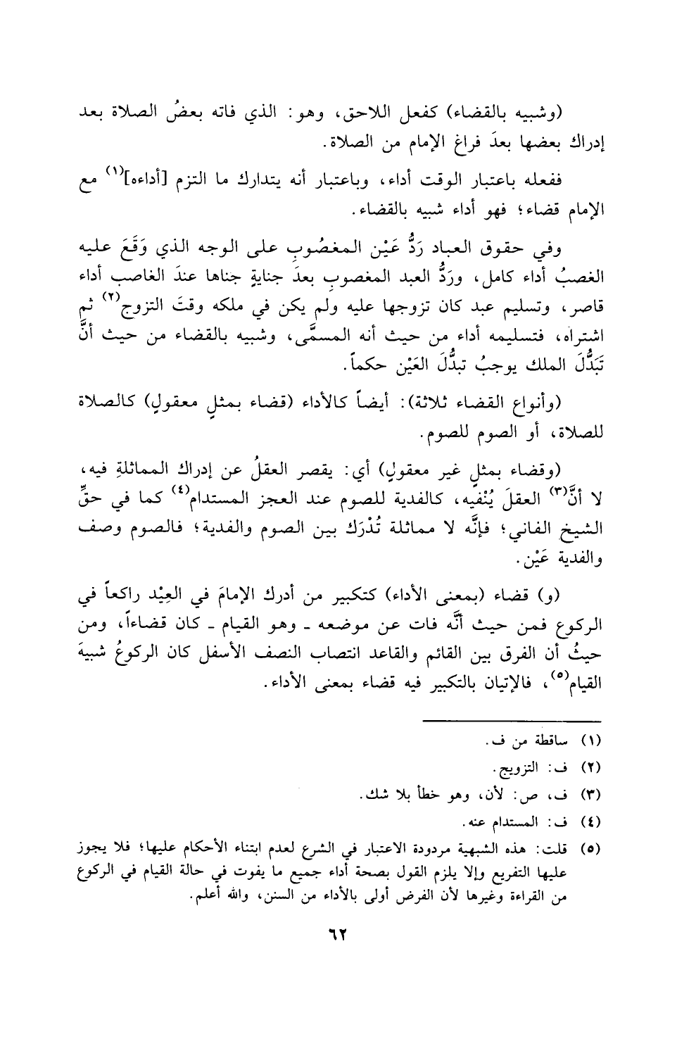 (وقضاء بمثل غير معقول): أي يقصر العقل عن إدراك المماثلة فيه؛ لأن العقل ينفيه كالفدية للصوم عند العجز المستدام، كما في حق الشيخ الفاني، فإنه لا مماثلة تدرك بين الصوم والفدية، فالصوم وصف، والفدية عين.