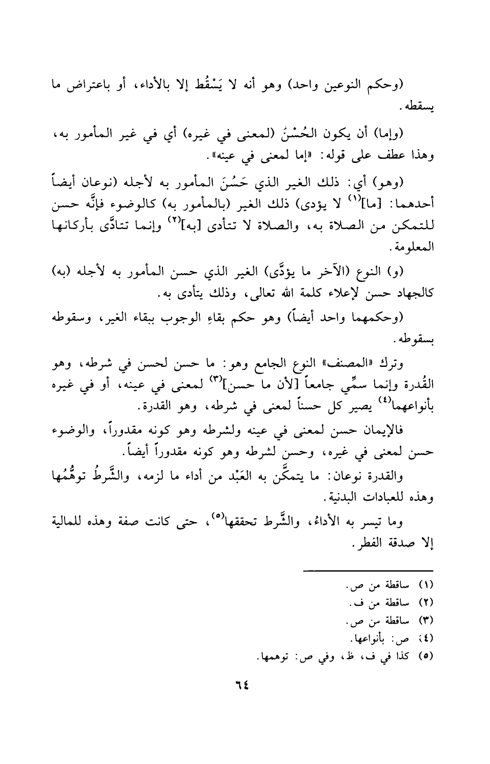 وترك المصنف النوع الجامع، وهو ما حَسُنَ لِحُسْن في شرطه وهو القدرة، وإنما سمي جامعاً لمعنى في عينه أو في غيره بأنواعهما يصير كلٌ حسناً لمعنى في شرطه وهو القدرة، فالإيمان حسن لمعنى في عينه ولشرطه وهو كونه مقدوراً، والوضوء حسن لمعنى في غيره، وحسن لشرطه وهو كونه مقدوراً أيضاً.