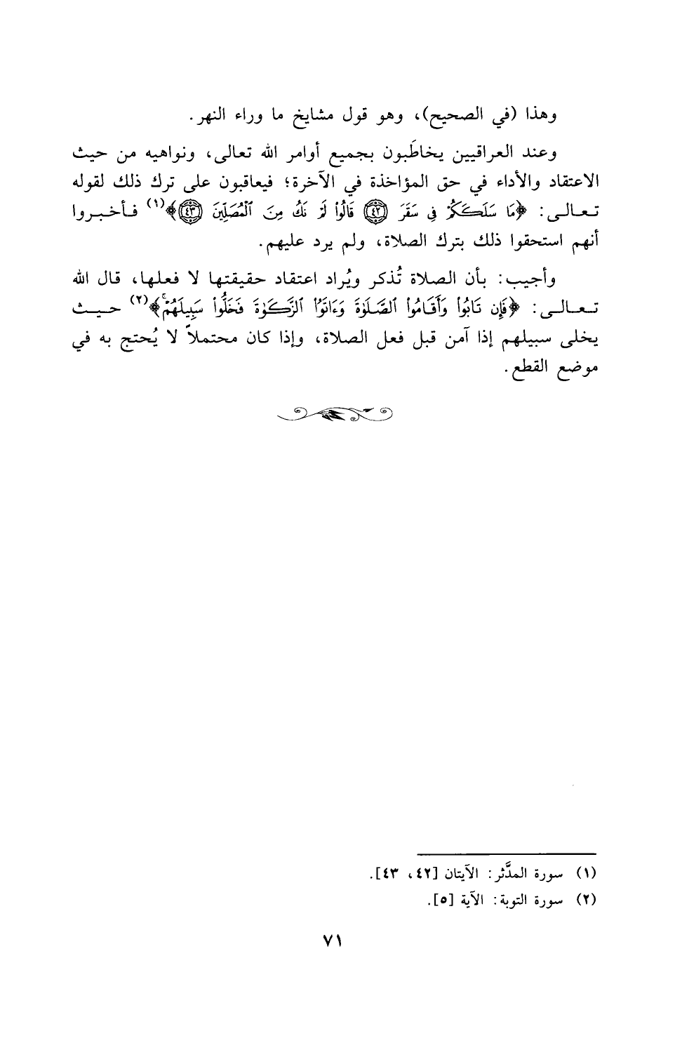 وأجيب: بأن الصلاة تذكر ويراد اعتقاد حقيتها لا فعلها، قال تعالى: {فَإِنْ تَابُوا وَأَقَامُوا الصَّلاةَ وَآتَوُا الزَّكَاةَ فَخَلُّوا سَبِيلَهُمْ}، حيث يخلي سبيله إذا آمن قبل فعل الصلاة، وإذا كان محتملاً لا يحتج به في موضع القطع.