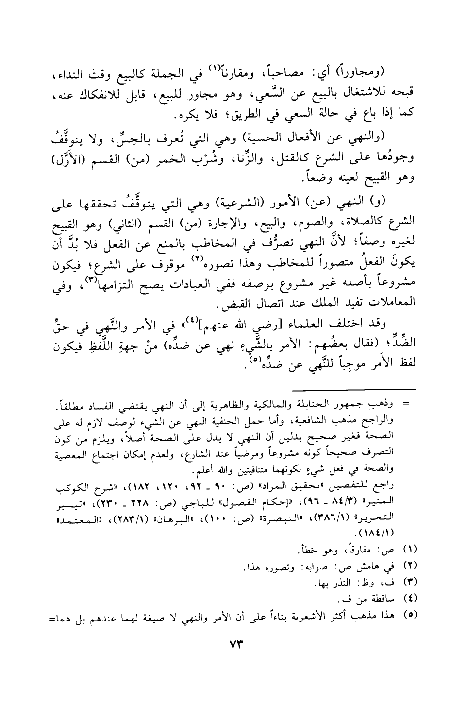 (و) النهي (عن) الأمور (الشرعية)، وهي التي يتوقف تحقيقها على الشرع، كالصلاة والصوم والبيع والإجارة (من) القسم (الثاني) وهو القبيح لغيره وصفاً؛ لأن النهي تصرف في المخاطب بالمنع عن الفعل، فلا بدّ أن يكون الفعل متصوّراً للمخاطب، وتصوره هذا موقوف على الشرع، فيكون مشروعاً بأصله غير مشروع بوصفه، ففي العبادات يصح التزامها، وفي المعاملات تفيد الملك عند اتصال القبض.