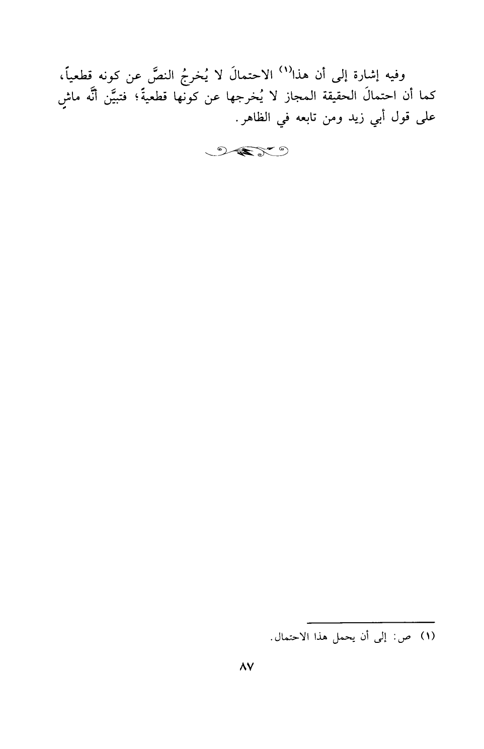 وفيه إشارة إلى أن هذا الاحتمال لا يخرج النص عن كونه قطعيّاً، كما أن احتمالَ الحقيقة المجاز لا يخرجها عن كونها قطعية، فتبيَّن أنه ماشٍ على قول أبي زيد ومن تابعه في الظاهر.