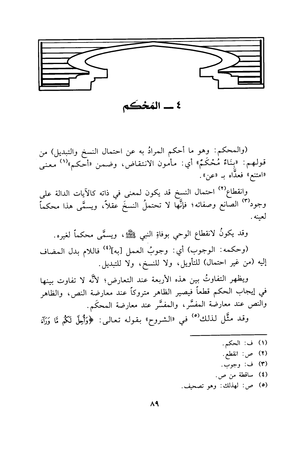 (والمحكم: وهو ما أحكم المراد به عن احتمال النسخ والتبديل) من قولهم بناء محكم: أي مأمون الانتقاض، وضمَّن أحكم معنى امتنع فعداه بعن.