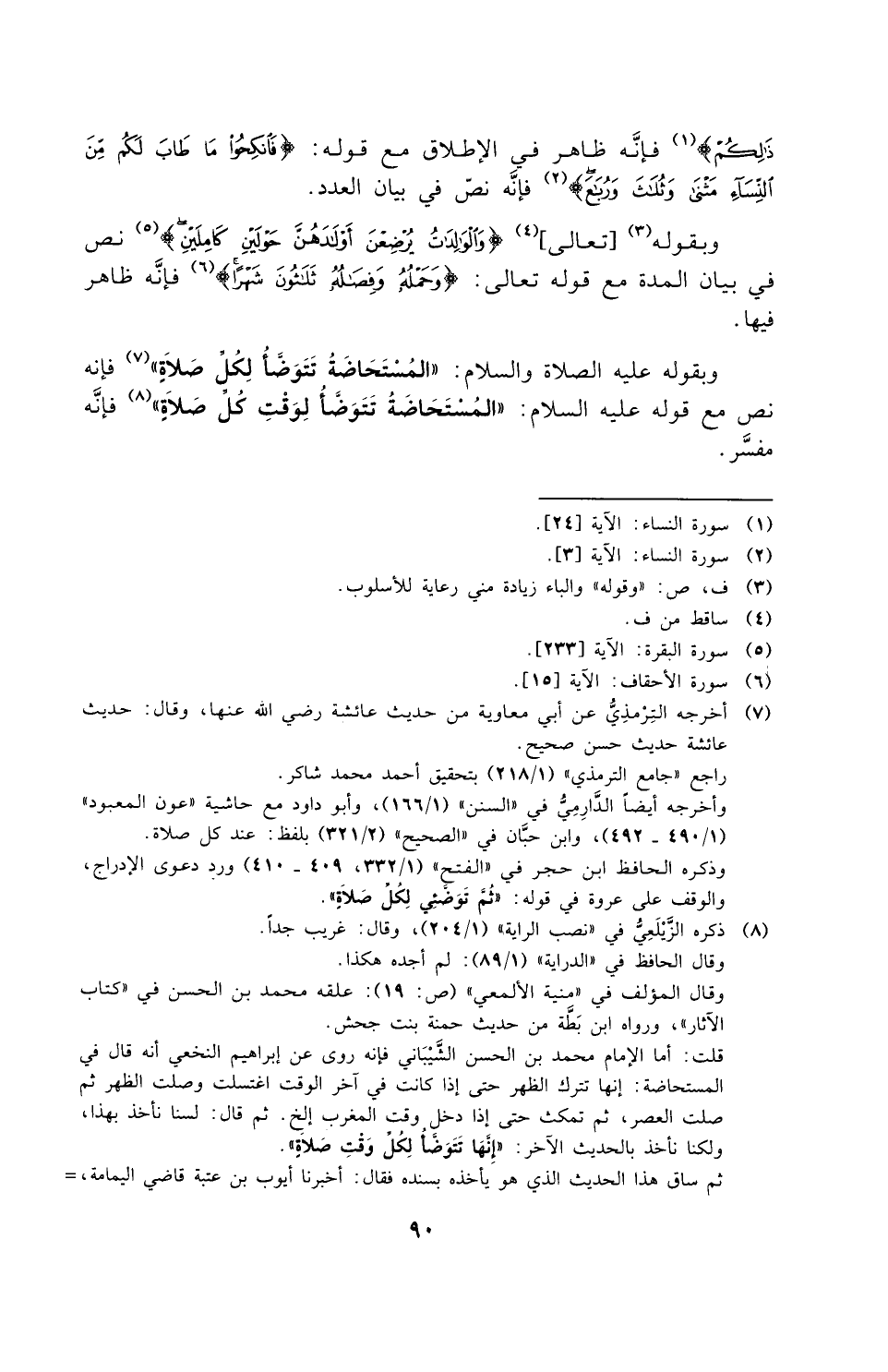 وبقوله عليه الصلاة والسلام: ((المستحاضة تتوضأ لكل صلاة)) فإنه نصّ، مع قوله عليه السلام: ((المستحاضة تتوضأ لوقت كل صلاة)) فإنه مفسّر.