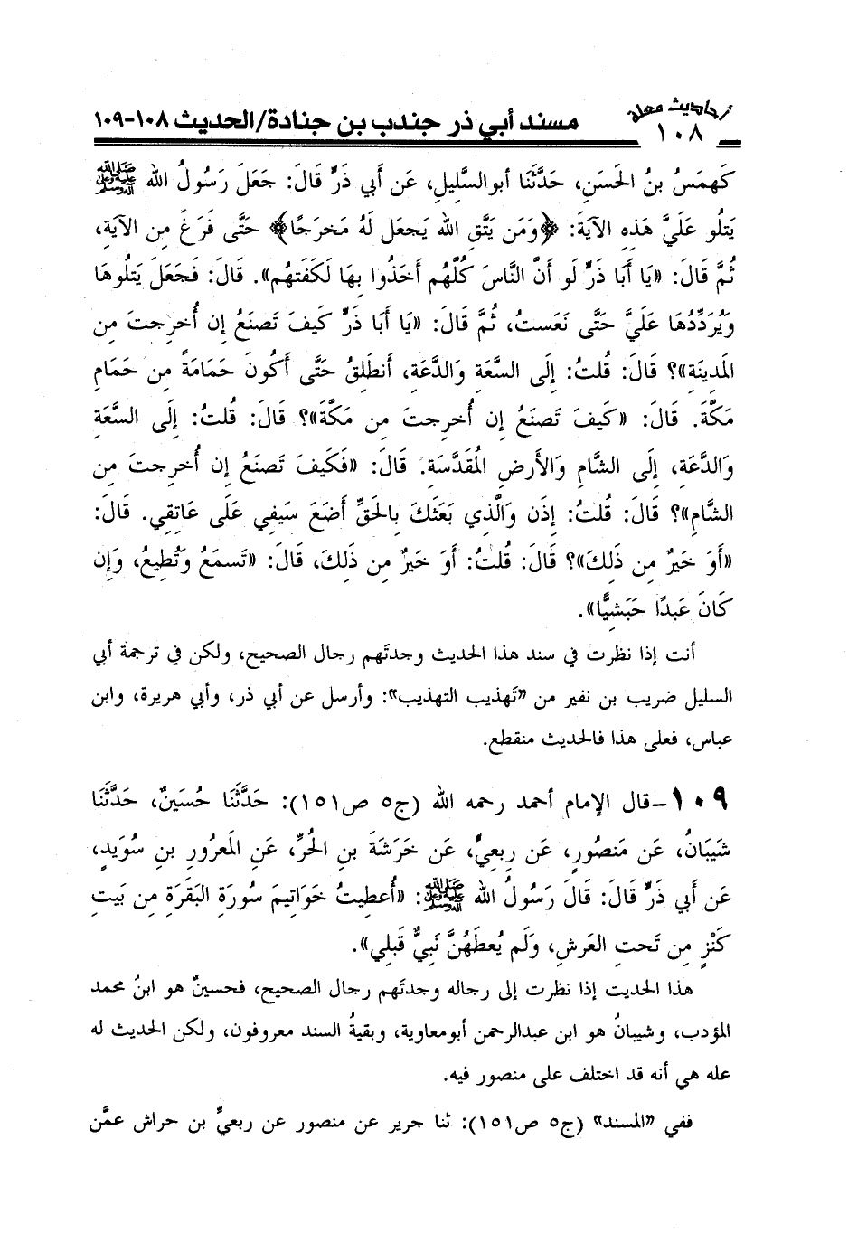 109-قال الإمام أحمد رحمه الله (ج5ص151) : حَدَّثَنَا حُسَيْنٌ حَدَّثَنَا شَيْبَانُ عَنْ مَنْصُورٍ عَنْ رِبْعِيٍّ عَنْ خَرَشَةَ بْنِ الْحُرِّ عَنِ الْمَعْرُورِ بْنِ سُوَيْدٍ عَنْ أَبِي ذَرٍّ قَالَ: قَالَ رَسُولُ اللَّهِ صَلَّى اللَّهُ عَلَيْهِ وعلى آله وَسَلَّمَ أُعْطِيتُ خَوَاتِيمَ سُورَةِ الْبَقَرَةِ مِنْ بَيْتِ كَنْزٍ مِنْ تَحْتِ الْعَرْشِ وَلَمْ يُعْطَهُنَّ نَبِيٌّ قَبْلِي.