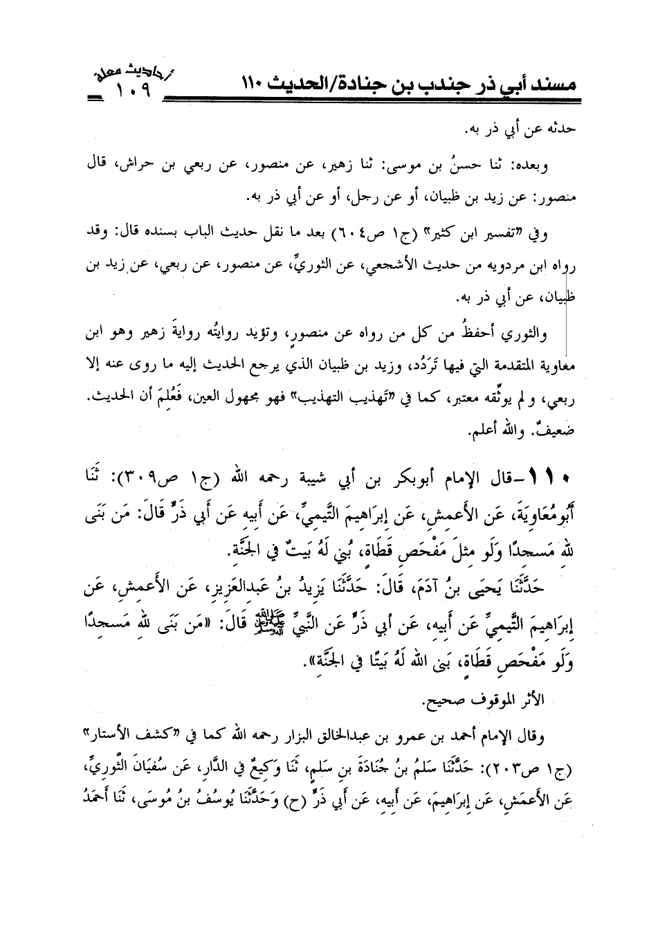 110-قال الإمام أبو بكر بن أبي شيبة رحمه الله (ج1ص309) : ثنا أبو معاوية عن الأعمش عن إبراهيم التيمي عن أبيه عن أبي ذر قال: من بنى لله مسجداً ولو مثل مفحص قطاة بنى له بيت في الجنة.