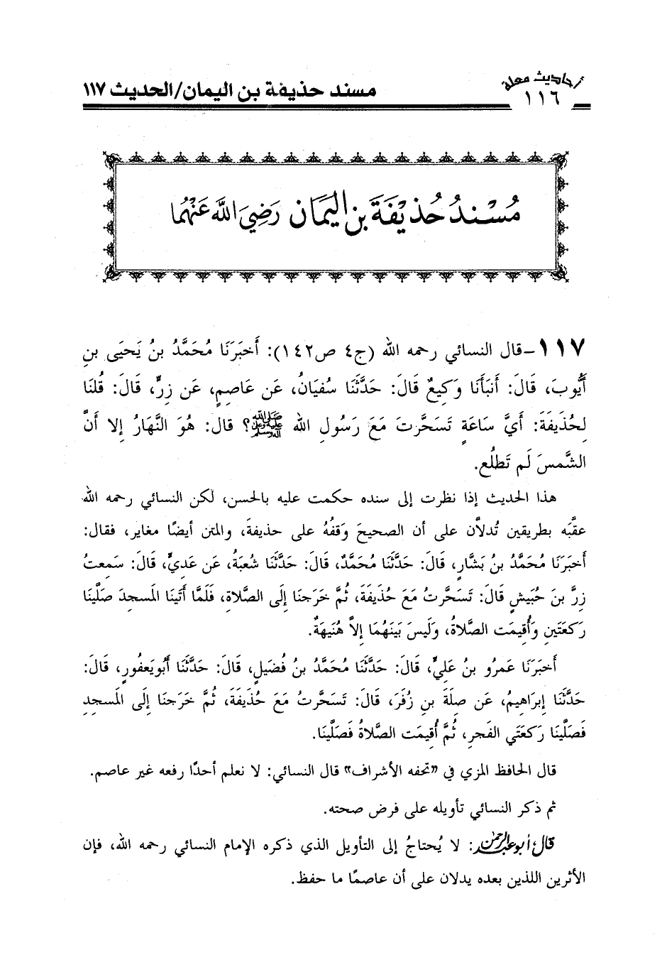هذا الحديث إذا نظرت إلى سنده حكمت عليه بالحسن، لكن النسائي رحمه الله عقبه بطريقين تدلان على أن الصحيح وقفه على حذيفة والمتن أيضا مغاير فقال: أَخْبَرَنَا مُحَمَّدُ بْنُ بَشَّارٍ قَالَ حَدَّثَنَا مُحَمَّدٌ قَالَ حَدَّثَنَا شُعْبَةُ عَنْ عَدِيٍّ قَالَ سَمِعْتُ زِرَّ بْنَ حُبَيْشٍ قَالَ