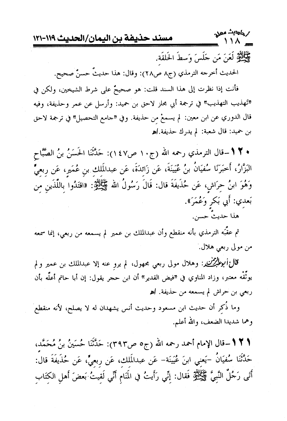 فأنت إذا نظرت إلى هذا السند قلت: هو صحيح على شرط الشيخين، ولكن في "تهذيب التهذيب" في ترجمة أبي مجلز لا حق بن حميد: وأرسل عن عمر وحذيفة، وفيه قال الدوري عن ابن معين: لم يسمع من حذيفة. وفي "جامع التحصيل" في ترجمة لاحق بن حميد: قال شعبة: لم يدرك حذيفة. اهـ