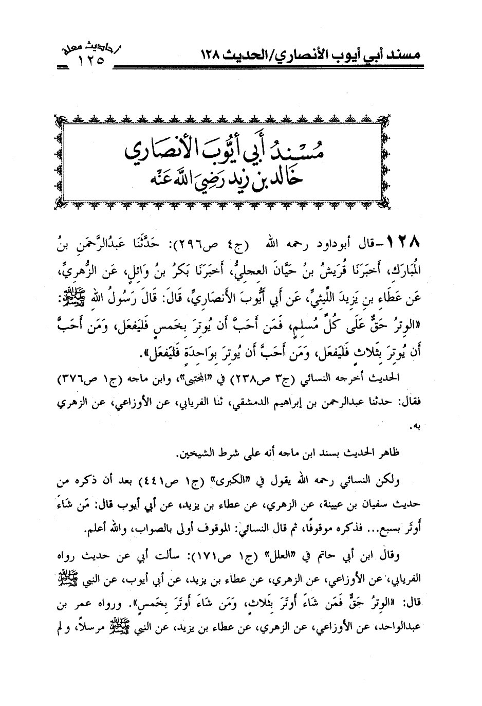128-قال أبو داود رحمه الله (ج4ص296) : حَدَّثَنَا عَبْدُ الرَّحْمَنِ بْنُ الْمُبَارَكِ أخبَرَنَا قُرَيْشُ بْنُ حَيَّانَ الْعِجْلِيُّ حَدَّثَنَا بَكْرُ بْنُ وَائِلٍ عَنْ الزُّهْرِيِّ عَنْ عَطَاءِ بْنِ يَزِيدَ اللَّيْثِيِّ عَنْ أَبِي أَيُّوبَ الْأَنْصَارِيِّ قَالَ قَالَ رَسُولُ اللَّهِ صَلَّى اللَّهُ عَلَيْهِ وعلى آله وَسَلَّمَ الْوِتْرُ حَقٌّ عَلَى كُلِّ مُسْلِمٍ فَمَنْ أَحَبَّ أَنْ يُوتِرَ بِخَمْسٍ فَلْيَفْعَلْ وَمَنْ أَحَبَّ أَنْ يُوتِرَ بِثَلَاثٍ فَلْيَفْعَلْ وَمَنْ أَحَبَّ أَنْ يُوتِرَ بِوَاحِدَةٍ فَلْيَفْعَلْ) .