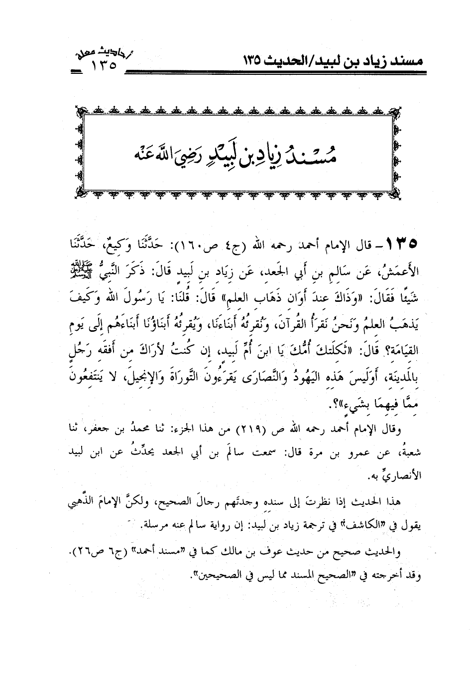 135-قال الإمام أحمد رحمه الله (ج4ص160) : حَدَّثَنَا وَكِيعٌ حَدَّثَنَا الْأَعْمَشُ عَنْ سَالِمِ بْنِ أَبِي الْجَعْدِ عَنْ زِيَادِ بْنِ لَبِيدٍ قَالَ ذَكَرَ النَّبِيُّ صَلَّى اللَّهُ عَلَيْهِ وعلى آله وَسَلَّمَ شَيْئًا فَقَالَ وَذَاكَ عِنْدَ أَوَانِ ذَهَابِ الْعِلْمِ قَالَ قُلْنَا يَا رَسُولَ اللَّهِ وَكَيْفَ يَذْهَبُ الْعِلْمُ وَنَحْنُ نَقْرَأُ الْقُرْآنَ وَنُقْرِئُهُ أَبْنَاءَنَا وَيُقْرِئُهُ أَبْنَاؤُنَا أَبْنَاءَهُمْ إِلَى يَوْمِ الْقِيَامَةِ قَالَ ثَكِلَتْكَ أُمُّكَ يَا ابْنَ أُمِّ لَبِيدٍ إِنْ كُنْتُ لَأَرَاكَ مِنْ أَفْقَهِ رَجُلٍ بِالْمَدِينَةِ أَوَلَيْسَ هَذِهِ الْيَهُودُ وَالنَّصَارَى يَقْرَءُونَ التَّوْرَاةَ وَالْإِنْجِيلَ لَا يَنْتَفِعُونَ مِمَّا فِيهِمَا بِشَيْءٍ؟) .