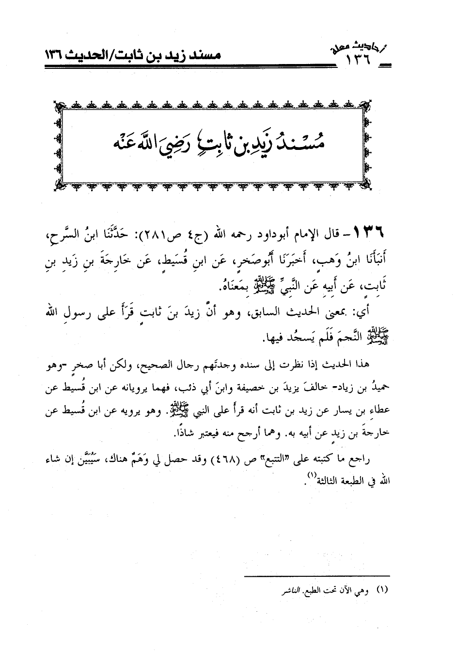 136-قال الإمام أبو داود رحمه الله (ج4ص281) : حَدَّثَنَا ابْنُ السَّرْحِ أَخْبَرَنَا ابْنُ وَهْبٍ حَدَّثَنَا أَبُو صَخْرٍ عَنِ ابْنِ قُسَيْطٍ عَنْ خَارِجَةَ بْنِ زَيْدِ بْنِ ثَابِتٍ عَنْ أَبِيهِ عَنِ النَّبِىِّ صَلَّى اللَّهُ عَلَيْهِ وعلى آله وَسَلَّمَ بِمَعْنَاهُ