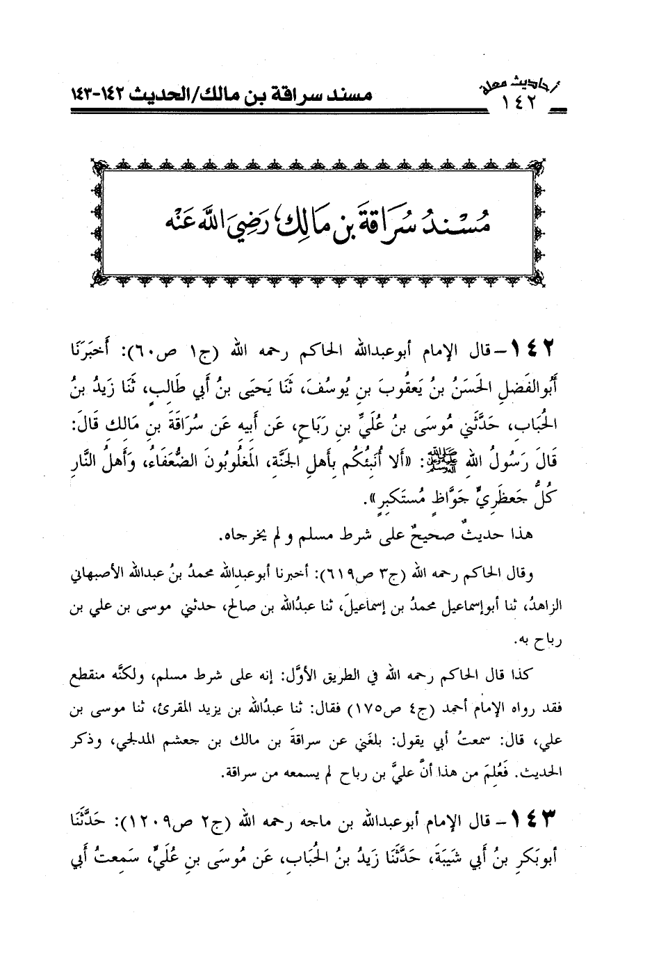 142-قال الحاكم رحمه الله (ج1ص60) : أخبرنا أبو الفضل الحسن بن يعقوب بن يوسف، ثنا يحيى بن أبي طالب، ثنا زيد بن الحباب، حدثني موسى بن علي بن رباح، عن أبيه، عن سراقة بن مالك، قال: قال رسول الله صَلَّى اللَّهُ عَلَيْهِ وعلى آله وَسَلَّمَ: " ألا أنبئكم بأهل الجنة؟ المغلوبون الضعفاء، وأهل النار كل جعظري جواظ مستكبر ".