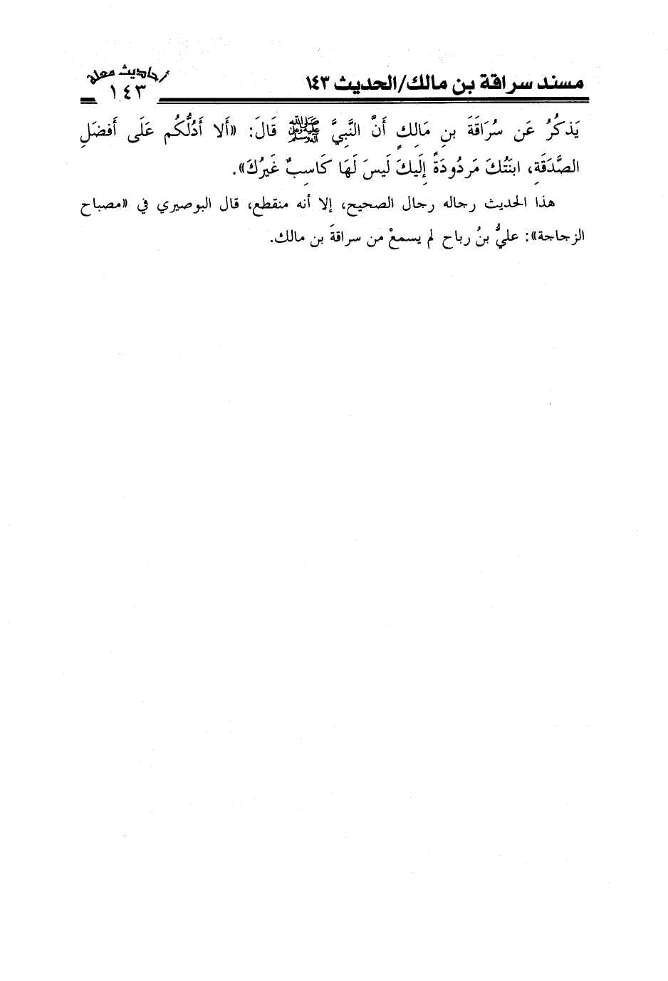 يَذْكُرُ عَنْ سُرَاقَةَ بْنِ مَالِكٍ: أَنَّ النَّبِيَّ صَلَّى اللَّهُ عَلَيْهِ وعلى آله وَسَلَّمَ قَالَ أَلَا أَدُلُّكُمْ عَلَى أَفْضَلِ الصَّدَقَةِ ابْنَتُكَ مَرْدُودَةً إِلَيْكَ لَيْسَ لَهَا كَاسِبٌ غَيْرُكَ.
