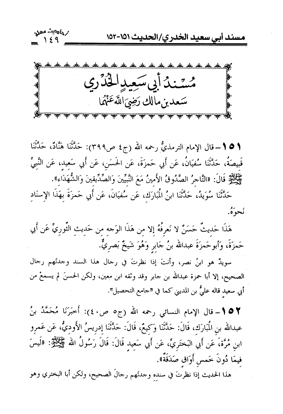151-قال الإمام الترمذي رحمه الله (ج4ص399) : حَدَّثَنَا هَنَّادٌ حَدَّثَنَا قَبِيصَةُ عَنْ سُفْيَانَ عَنْ أَبِي حَمْزَةَ عَنْ الْحَسَنِ عَنْ أَبِي سَعِيدٍ عَنْ النَّبِيِّ صَلَّى اللَّهُ عَلَيْهِ وعلى آله وَسَلَّمَ قَالَ التَّاجِرُ الصَّدُوقُ الْأَمِينُ مَعَ النَّبِيِّينَ وَالصِّدِّيقِينَ وَالشُّهَدَاءِ.
