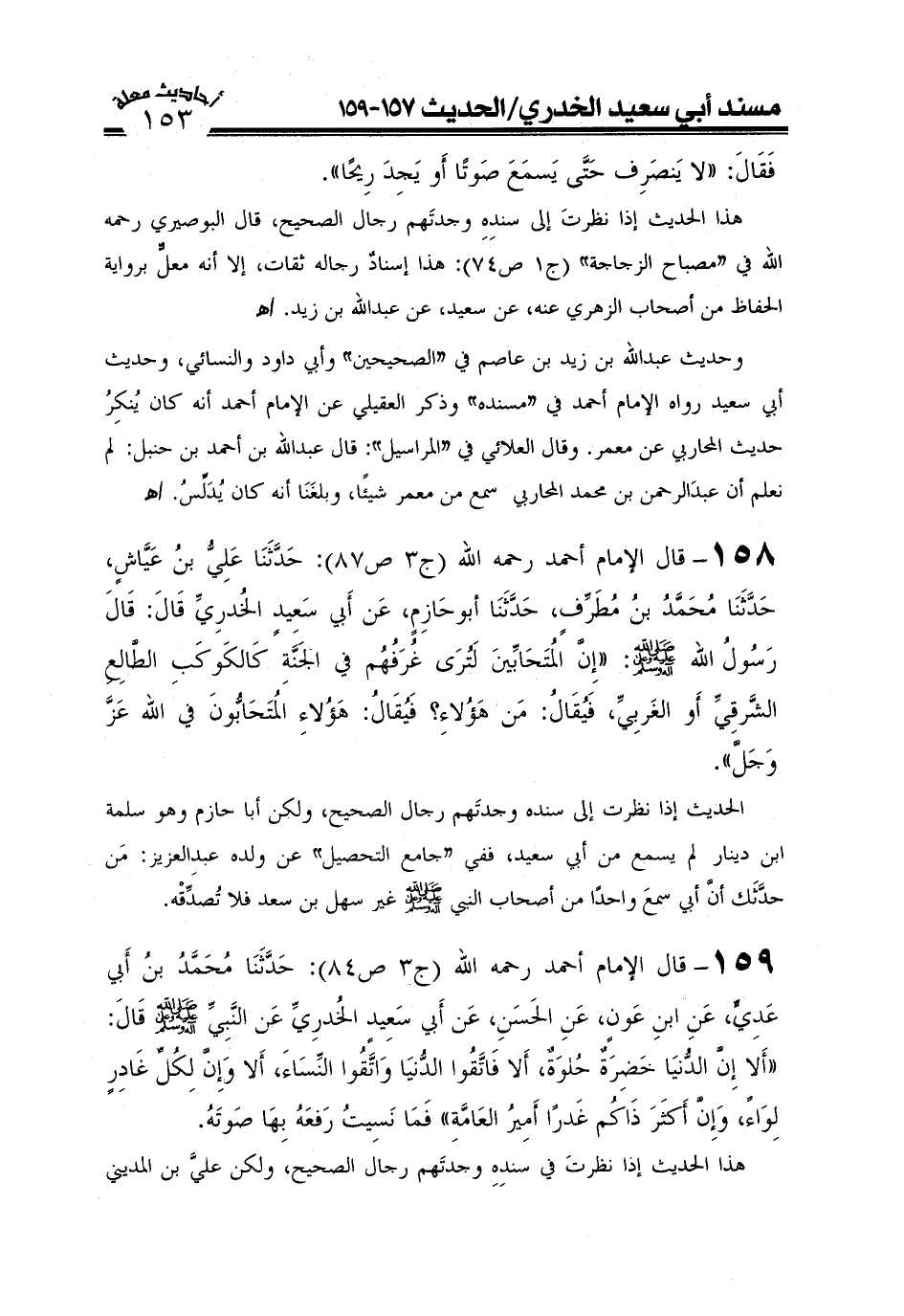 159-قال الإمام أحمد رحمه الله (ج3ص84) : حَدَّثَنَا مُحَمَّدُ بْنُ أَبِي عَدِيٍّ عَنِ ابْنِ عَوْنٍ عَنِ الْحَسَنِ عَنْ أَبِي سَعِيدٍ الْخُدْرِيِّ عَنْ النَّبِيِّ صَلَّى اللَّهُ عَلَيْهِ وعلى آله وَسَلَّمَ قَالَ: (أَلَا إِنَّ الدُّنْيَا خَضِرَةٌ حُلْوَةٌ أَلَا فَاتَّقُوا الدُّنْيَا وَاتَّقُوا النِّسَاءَ أَلَا وَإِنَّ لِكُلِّ غَادِرٍ لِوَاءً وَإِنَّ أَكْثَرَ ذَاكُمْ غَدْرًا أَمِيرُ الْعَامَّةِ فَمَا نَسِيتُ رَفْعَهُ بِهَا صَوْتَهُ) .