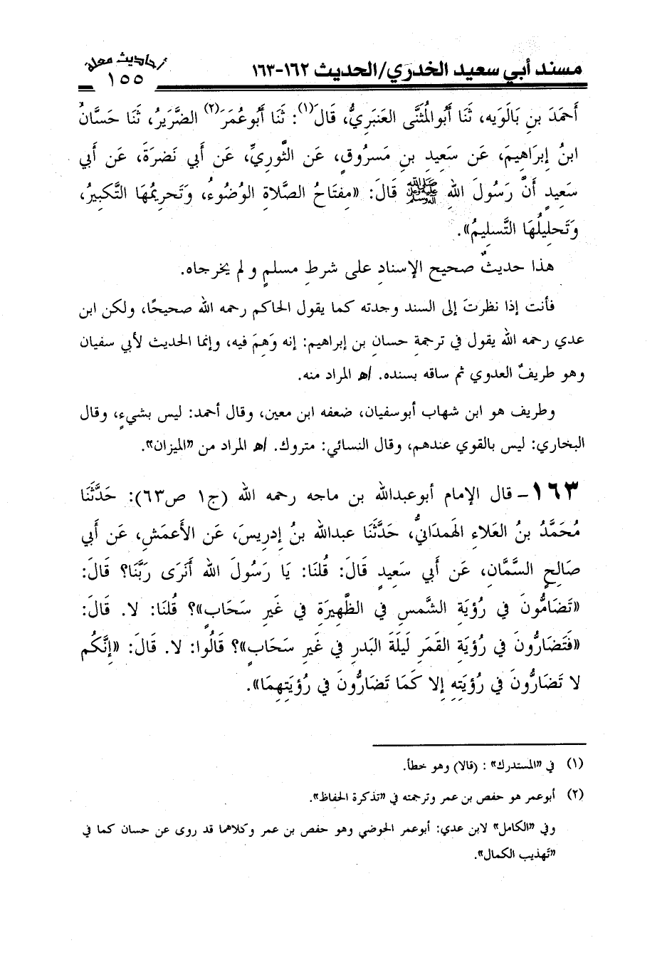 163-قال الإمام ابو عبد الله ابن ماجه رحمه الله (ج1ص63) : حَدَّثَنَا مُحَمَّدُ بْنُ الْعَلَاءِ الْهَمْدَانِيُّ حَدَّثَنَا عَبْدُ اللَّهِ بْنُ إِدْرِيسَ عَنْ الْأَعْمَشِ عَنْ أَبِي صَالِحٍ السَّمَّانِ عَنْ أَبِي سَعِيدٍ قَالَ: قُلْنَا يَا رَسُولَ اللَّهِ أَنَرَى رَبَّنَا قَالَ: (تَضَامُّونَ فِي رُؤْيَةِ الشَّمْسِ فِي الظَّهِيرَةِ فِي غَيْرِ سَحَابٍ قُلْنَا لَا قَالَ فَتَضَارُّونَ فِي رُؤْيَةِ الْقَمَرِ لَيْلَةَ الْبَدْرِ فِي غَيْرِ سَحَابٍ قَالُوا لَا قَالَ إِنَّكُمْ لَا تَضَارُّونَ فِي رُؤْيَتِهِ إِلَّا كَمَا تَضَارُّونَ فِي رُؤْيَتِهِمَا)