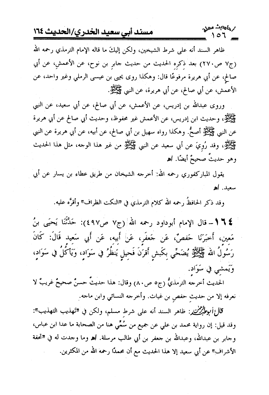 164- قال الإمام أبو داود رحمه الله (ج7ص497) : حَدَّثَنَا يَحْيَى بْنُ مَعِينٍ حَدَّثَنَا حَفْصٌ عَنْ جَعْفَرٍ عَنْ أَبِيهِ عَنْ أَبِي سَعِيدٍ قَالَ: كَانَ رَسُولُ اللَّهِ يُضَحِّي صَلَّى اللَّهُ عَلَيْهِ وعلى آله وَسَلَّمَ بِكَبْشٍ أَقْرَنَ فَحِيلٍ يَنْظُرُ فِي سَوَادٍ وَيَأْكُلُ فِي سَوَادٍ وَيَمْشِي فِي سَوَادٍ.