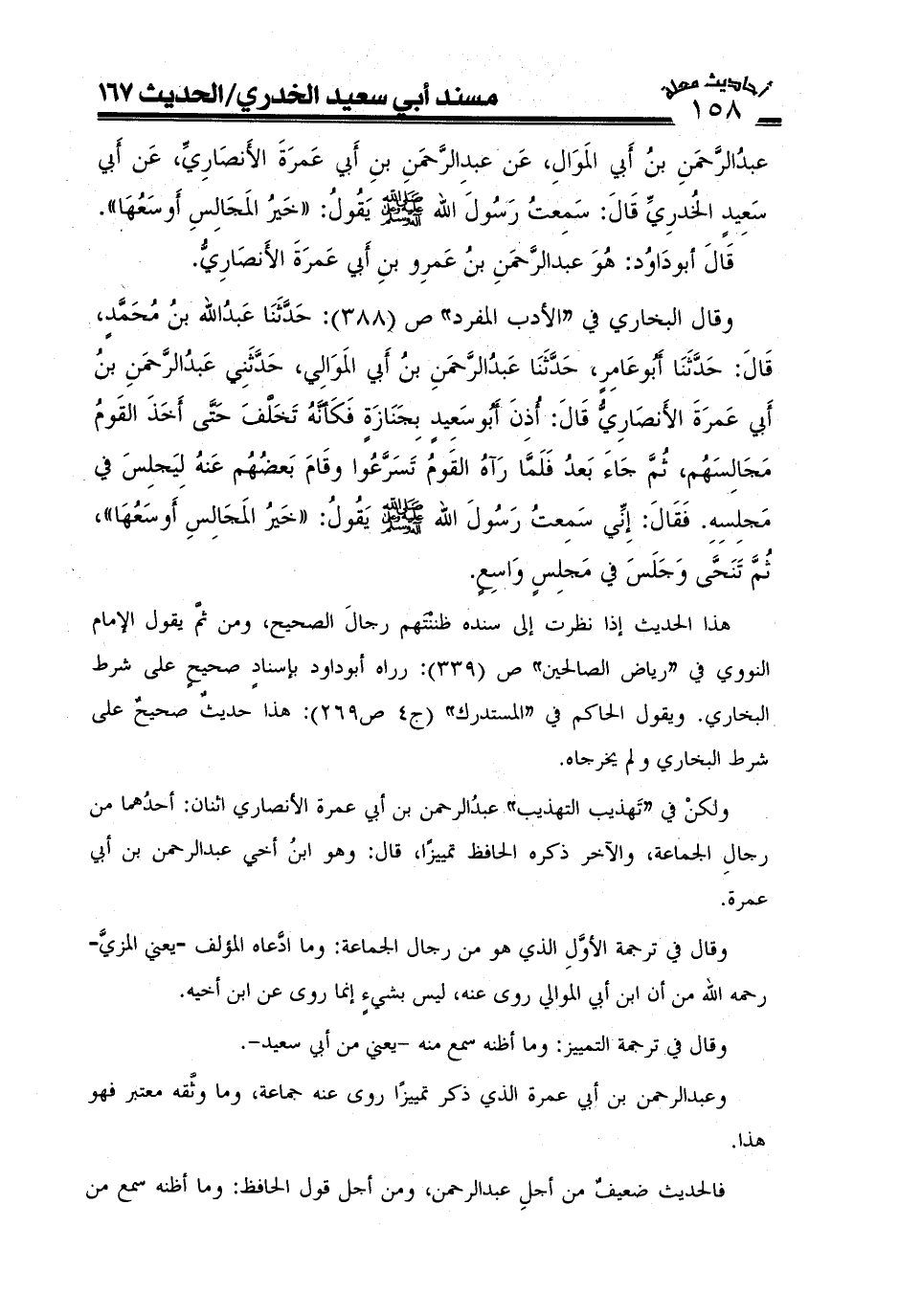 وقال البخاري في "الأدب المفرد" ص (388) : حدثنا عبد الله بن محمد، قال حدثنا أبو عامر، حدثنا عبد الرحمن بن أبي الموالي، حدثني عبد الرحمن بن أبي عمرة الأنصاري قال: أذن أبو سعيد بجنازة فكأنه تخلف حتى أخذالقوم مجالسهم، ثم جاء بعد فلما رآه القوم تسرعوا وقام بعضهم عنه ليجلس في مجلسه. فقال: إني سمعت رسول الله صَلَّى اللَّهُ عَلَيْهِ وعلى آله وَسَلَّمَ يقول: خير المجالس أوسعها، ثم تنحى وجلس في مجلس واسع.