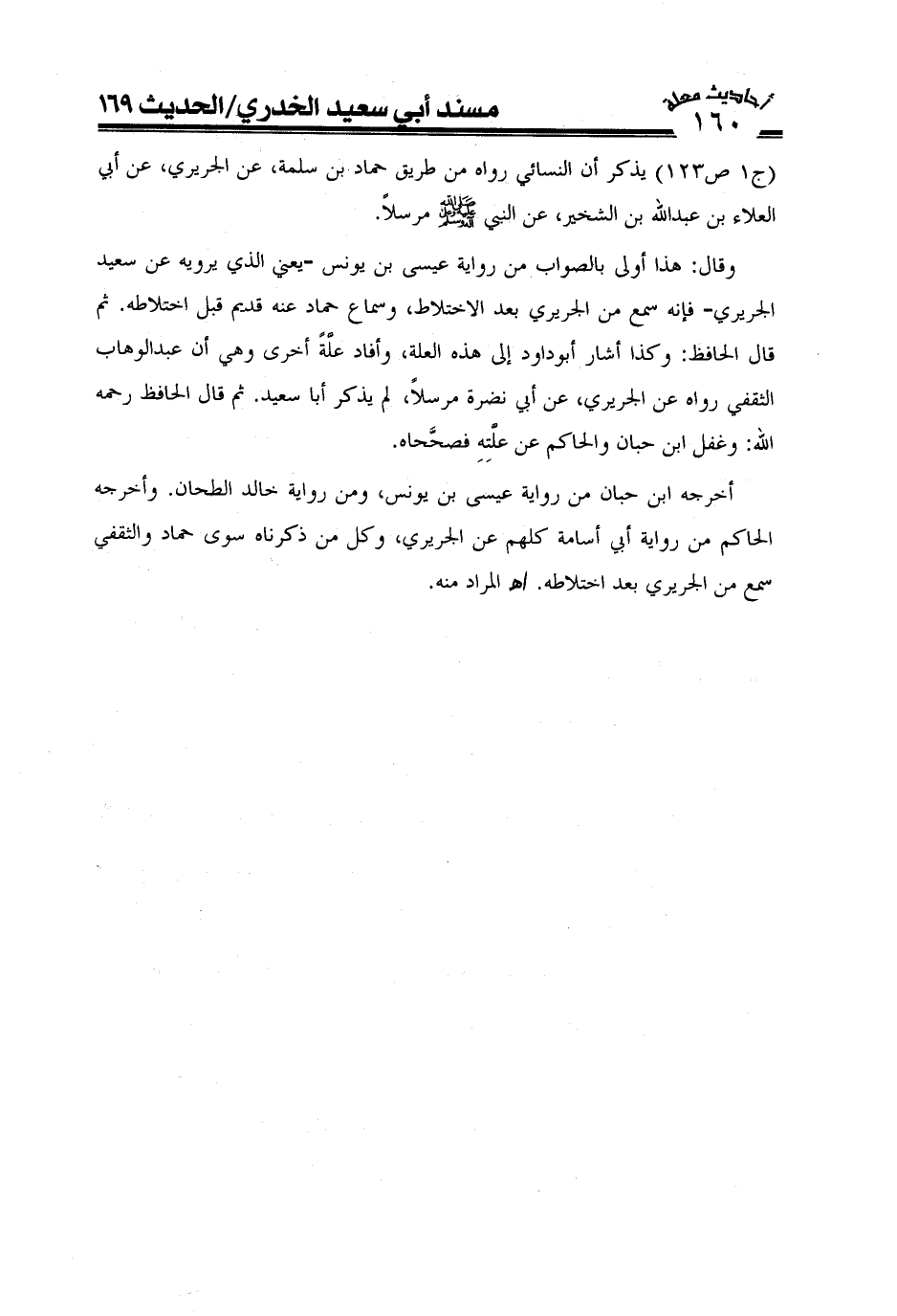 وقال: هذا أولى بالصواب من رواية عيسى بن يونس -يعنى الذى يرويه عن سعيد الجريرى -فإنه سمع من الجريرى بعد الإختلاط وسماع حماد عنه قديم قبل اختلاطه ثم قال الحافظ: وكذا أشار أبو داود إلى هذه العلة وأفاد علة أخرى وهى أن عبد الوهاب الثقفى رواه عن الجريرى عن أبى نضرة مرسلا لم يذكر أبا سعيد وغفل ابن حبان والحاكم عن علته فصححاه