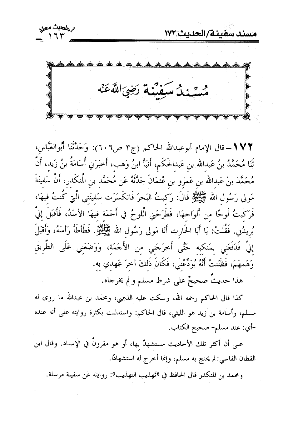 172- قال الإمام أبو عبد الله الحاكم رحمه الله (ج3ص606) : حدثنا أبو العباس، ثنا محمد بن عبد الله بن عبد الحكم، أنبأ ابن وهب، أخبرني أسامة بن زيد، أن محمد بن عبد الله بن عمرو بن عثمان، حدثه، عن محمد بن المنكدر، أن سفينة، مولى رسول الله صَلَّى اللَّهُ عَلَيْهِ وعلى آله وَسَلَّمَ، قال: " ركبت البحر فانكسرت سفينتي التي كنت فيها فركبت لوحا من ألواحها فطرحني اللوح في أجمة فيها الأسد فأقبل إلي يريدني فقلت: يا أبا الحارث، أنا مولى رسول الله صَلَّى اللَّهُ عَلَيْهِ وعلى آله وَسَلَّمَ فطأطأ رأسه، وأقبل إلي فدفعني بمنكبه حتى أخرجني من الأجمة، ووضعني على الطريق وهمهم فظننت أنه يودعني فكان ذلك آخر عهدي به " هذا حديث صحيح على شرط مسلم، ولم يخرجاه.