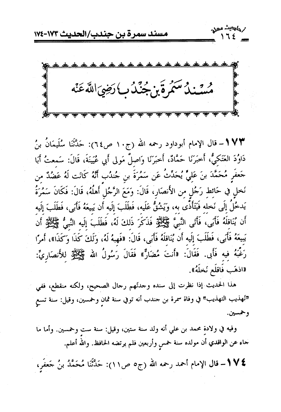 173-قال الإمام أبو داود رحمه الله (ج10ص64) : حَدَّثَنَا سُلَيْمَانُ بْنُ دَاوُدَ الْعَتَكِيُّ حَدَّثَنَا حَمَّادٌ حَدَّثَنَا وَاصِلٌ مَوْلَى أَبِي عُيَيْنَةَ قَالَ سَمِعْتُ أَبَا جَعْفَرٍ مُحَمَّدَ بْنَ عَلِيٍّ يُحَدِّثُ عَنْ سَمُرَةَ بْنِ جُنْدُبٍ: أَنَّهُ كَانَتْ لَهُ عَضُدٌ مِنْ نَخْلٍ فِي حَائِطِ رَجُلٍ مِنْ الْأَنْصَارِ قَالَ وَمَعَ الرَّجُلِ أَهْلُهُ قَالَ فَكَانَ سَمُرَةُ يَدْخُلُ إِلَى نَخْلِهِ فَيَتَأَذَّى بِهِ وَيَشُقُّ عَلَيْهِ فَطَلَبَ إِلَيْهِ أَنْ يَبِيعَهُ فَأَبَى فَطَلَبَ إِلَيْهِ أَنْ يُنَاقِلَهُ فَأَبَى فَأَتَى النَّبِيَّ صَلَّى اللَّهُ عَلَيْهِ وعلى آله وَسَلَّمَ فَذَكَرَ ذَلِكَ لَهُ فَطَلَبَ إِلَيْهِ النَّبِيُّ صَلَّى اللَّهُ عَلَيْهِ وعلى آله وَسَلَّمَ أَنْ يَبِيعَهُ فَأَبَى فَطَلَبَ إِلَيْهِ أَنْ يُنَاقِلَهُ فَأَبَى قَالَ فَهِبْهُ لَهُ وَلَكَ كَذَا وَكَذَا أَمْرًا رَغَّبَهُ فِيهِ فَأَبَى فَقَالَ أَنْتَ مُضَارٌّ فَقَالَ رَسُولُ اللَّهِ صَلَّى اللَّهُ عَلَيْهِ وعلى آله وَسَلَّمَ (لِلْأَنْصَارِيِّ اذْهَبْ فَاقْلَعْ نَخْلَهُ) .