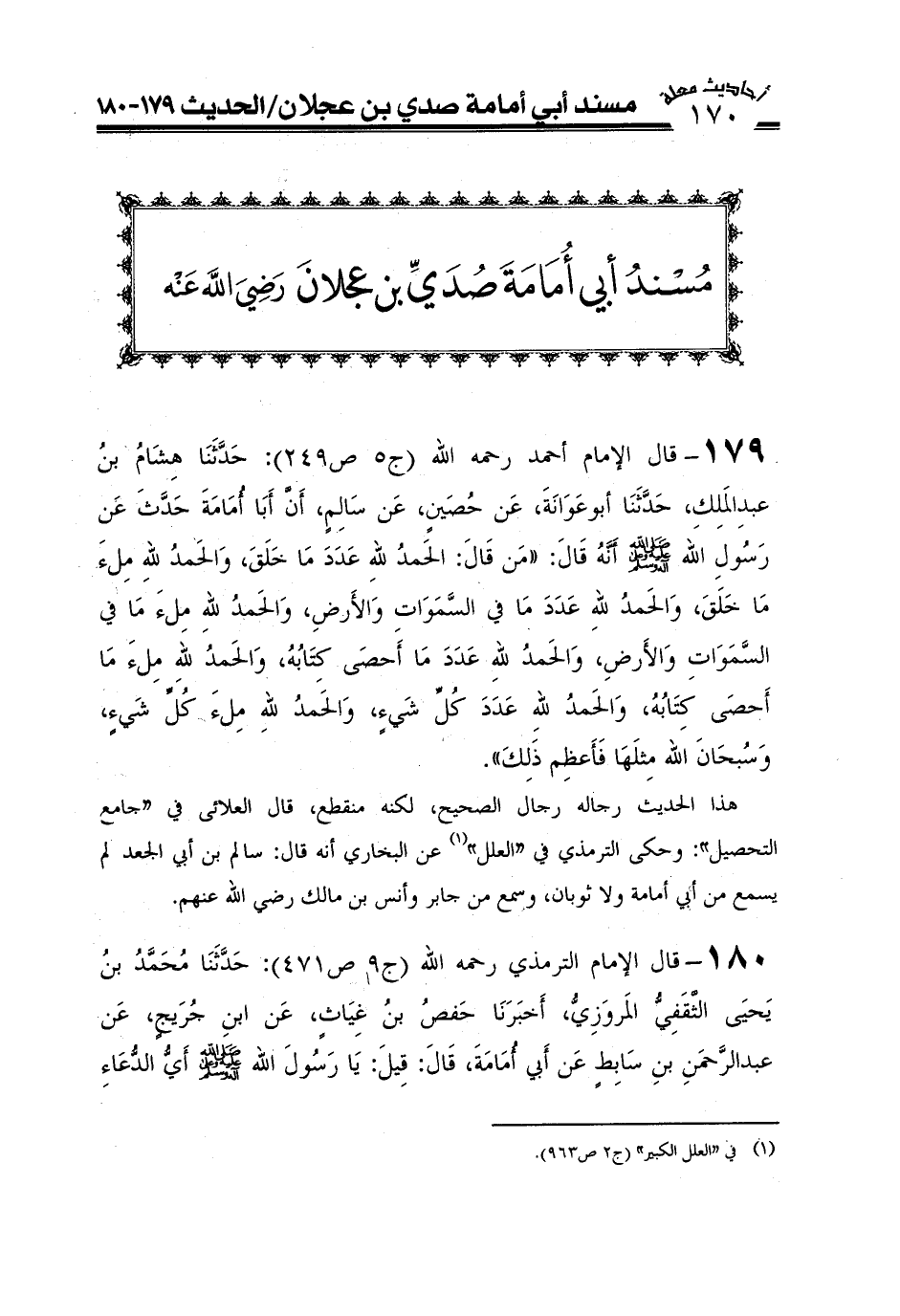 179- قال الإمام أحمد رحمه الله (ج5ص249) : حَدَّثَنَا هِشَامُ بْنُ عَبْدِ الْمَلِكِ حَدَّثَنَا أَبُو عَوَانَةَ عَنْ حُصَيْنٍ عَنْ سَالِمٍ أَنَّ أَبَا أُمَامَةَ حَدَّثَ عَنْ رَسُولِ اللَّهِ صَلَّى اللَّهُ عَلَيْهِ وعلى آله وَسَلَّمَ أَنَّهُ قَالَ مَنْ قَالَ الْحَمْدُ لِلَّهِ عَدَدَ مَا خَلَقَ وَالْحَمْدُ لِلَّهِ مِلْءَ مَا خَلَقَ وَالْحَمْدُ لِلَّهِ عَدَدَ مَا فِي السَّمَوَاتِ وَالْأَرْضِ وَالْحَمْدُ لِلَّهِ مِلْءَ مَا فِي السَّمَوَاتِ وَالْأَرْضِ وَالْحَمْدُ لِلَّهِ عَدَدَ مَا أَحْصَى كِتَابُهُ وَالْحَمْدُ لِلَّهِ مِلْءَ مَا أَحْصَى كِتَابُهُ وَالْحَمْدُ لِلَّهِ عَدَدَ كُلِّ شَيْءٍ وَالْحَمْدُ لِلَّهِ مِلْءَ كُلِّ شَيءٍ، وسُبحَانَ الله مِثلَهَا فَأعظِم ذَلِكَ)