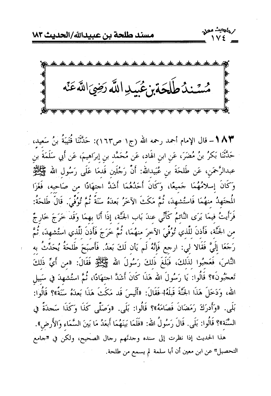 183-قال الإمام أحمد رحمه الله (ج1ص163) : حَدَّثَنَا قُتَيْبَةُ بْنُ سَعِيدٍ حَدَّثَنَا بَكْرُ بْنُ مُضَرَ عَنِ ابْنِ الْهَادِ عَنْ مُحَمَّدِ بْنِ إِبْرَاهِيمَ عَنْ أَبِي سَلَمَةَ بْنِ عَبْدِ الرَّحْمَنِ عَنْ طَلْحَةَ بْنِ عُبَيْدِ اللَّهِ: أَنَّ رَجُلَيْنِ قَدِمَا عَلَى رَسُولِ اللَّهِ صَلَّى اللَّهُ عَلَيْهِ وعلى آله وَسَلَّمَ وَكَانَ إِسْلامُهُمَا جَمِيعًا وَكَانَ أَحَدُهُمَا أَشَدَّ اجْتِهَادًا مِنْ صَاحِبِهِ فَغَزَا الْمُجْتَهِدُ مِنْهُمَا فَاسْتُشْهِدَ ثُمَّ مَكَثَ الْآخَرُ بَعْدَهُ سَنَةً ثُمَّ تُوُفِّيَ قَالَ طَلْحَةُ فَرَأَيْتُ فِيمَا يَرَى النَّائِمُ كَأَنِّي عِنْدَ بَابِ الْجَنَّةِ إِذَا أَنَا بِهِمَا وَقَدْ خَرَجَ خَارِجٌ مِنْ الْجَنَّةِ فَأَذِنَ لِلَّذِي تُوُفِّيَ الْآخِرَ مِنْهُمَا ثُمَّ خَرَجَ فَأَذِنَ لِلَّذِي اسْتُشْهِدَ ثُمَّ رَجَعَا إِلَيَّ فَقَالَا لِي ارْجِعْ فَإِنَّهُ لَمْ يَأْنِ لَكَ بَعْدُ فَأَصْبَحَ طَلْحَةُ يُحَدِّثُ بِهِ النَّاسَ فَعَجِبُوا لِذَلِكَ فَبَلَغَ ذَلِكَ رَسُولَ اللَّهِ صَلَّى اللَّهُ عَلَيْهِ وعلى آله وَسَلَّمَ فَقَالَ مِنْ أَيِّ ذَلِكَ تَعْجَبُونَ قَالُوا يَا رَسُولَ اللَّهِ هَذَا كَانَ أَشَدَّ اجْتِهَادًا ثُمَّ اسْتُشْهِدَ فِي سَبِيلِ اللَّهِ وَدَخَلَ هَذَا الْجَنَّةَ قَبْلَهُ فَقَالَ أَلَيْسَ قَدْ مَكَثَ هَذَا بَعْدَهُ سَنَةً قَالُوا بَلَى وَأَدْرَكَ رَمَضَانَ فَصَامَهُ قَالُوا بَلَى وَصَلَّى كَذَا وَكَذَا سَجْدَةً فِي السَّنَةِ قَالُوا بَلَى قَالَ رَسُولُ اللَّهِ فَلَمَا بَيْنَهُمَا أَبْعَدُ مَا بَيْنَ السَّمَاءِ وَالْأَرْضِ) .