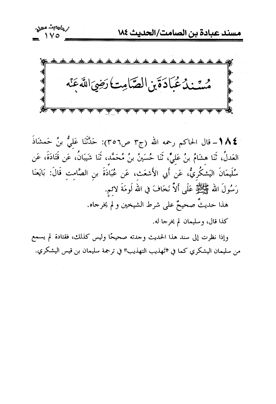184-قال الحاكم رحمه الله (ج3ص356) : حدثنا علي بن حمشاذ العدل، ثنا هشام بن علي، ثنا حسين بن محمد، ثنا شيبان، عن قتادة، عن سليمان اليشكري، عن أبي الأشعث، عن عبادة بن الصامت قال: " بايعنا رسول الله صَلَّى اللَّهُ عَلَيْهِ وعلى آله وَسَلَّمَ على أن لا نخاف في الله لومة لائم ".