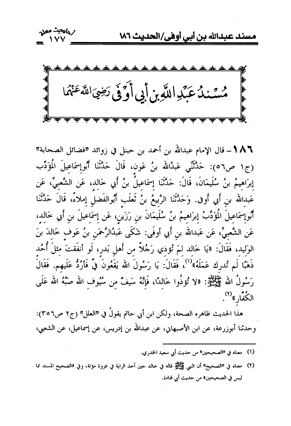186-قال الإمام عبد الله بن أحمد بن حنبل في زوائد "فضائل الصحابة" (ج1ص56) : حدثني عبد الله بن عون، قال: حدثنا أبو اسماعيل المؤدب ابراهيم بن سليمان، قال: حدثنا اسماعيل بن أبي خالد، عن الشعبي، عن عبد الله ابن أبي أوفى. وحدثنا الربيع بن ثعلب أبو الفضل إملاء، قال: حدثنا أبو اسماعيل المؤدب ابراهيم بن سليمان بن رزين، عن اسماعيل بن أبي خالد، عن الشعبي، عن عبد الله ابن أبي أوفى قال: " شكا عبد الرحمن بن عوف خالد بن الوليد- رضي الله عنه- إلى رسول الله صَلَّى اللَّهُ عَلَيْهِ وعلى آله وَسَلَّمَ فقال رسول الله صَلَّى اللَّهُ عَلَيْهِ وعلى آله وَسَلَّمَ يا خالد لم تؤذي رجلًا من أهل بدر؟ لو أنفقت مثل أحد ذهبًا لم تدرك عمله. فقال: يا رسول الله يقعون في فأرد عليهم. فقال رسول الله صَلَّى اللَّهُ عَلَيْهِ وعلى آله وَسَلَّمَ: لا تؤذوا خالدًا فإنه سيف من سيوف الله- عز وجل- صبَّه الله على الكفار ".