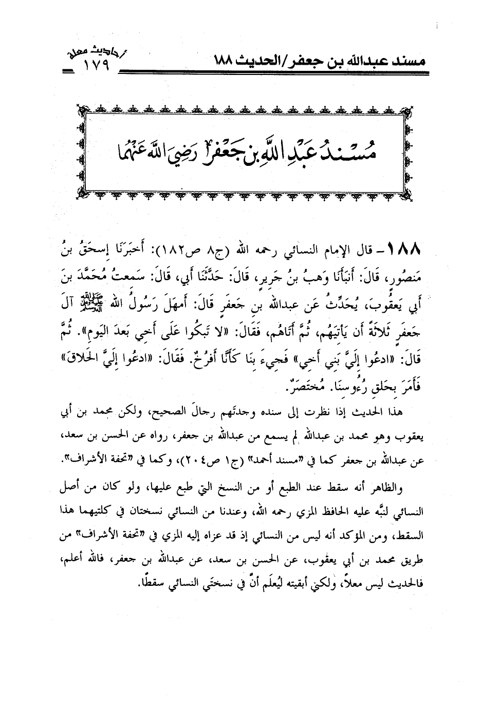 188-قال الإمام النسائي رحمه الله (ج8ص182) : أخبرنا اسحاق بن ابراهيم، قال: أنبأنا وهب بن جرير، قال: حدثنا أبي، قال: سمعت محمد بن أبي يعقوب، يحدث عن عبد الله بن جعفر قال: أمهل رسول الله صَلَّى اللَّهُ عَلَيْهِ وعلى آله وَسَلَّمَ آل جعفر ثلاثا أن يأتيهم، ثم أتاهم، فقال: لا تبكوا أخي بعد اليوم، ثم قال: ادعوا إلي بني أخي، فجئ بنا كأنا أفراخ، فقال: ادعوا الحلاق، فأمر بحلق رؤوسنا. مختصر.